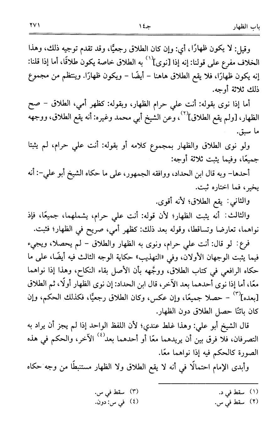 وقيل: لا يكون ظهاراً، أي: وإن كان الطلاق رجعيّاً، وقد تقدم توجيه ذلك، وهذا الخلاف مفرع على قولنا: إنه إذا [نوى] به الطلاق خاصة يكون طلاقاً، أما إذا قلنا: إنه يكون ظهاراً، فلا يقع الطلاق ها هنا- أيضاً- ويكون ظهاراً. وينتظم من مجموع ذلك ثلاثة أوجه.