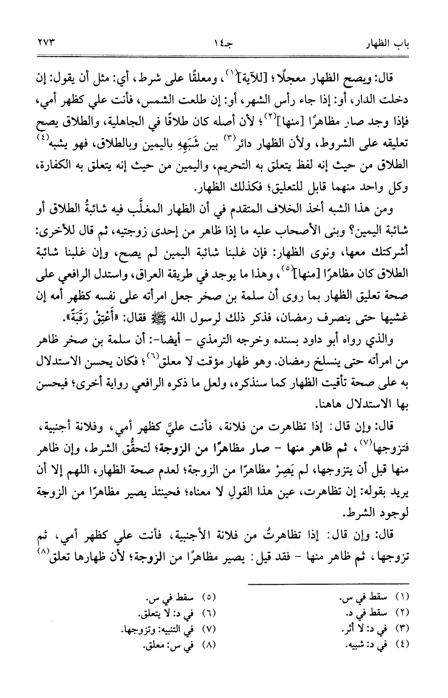 والذي رواه أبو داود بسنده وخرجه الترمذي- أيضاً-: أن سلمة بن صخر ظاهر من امرأته حتى ينسلخ رمضان. وهو ظهار مؤقت لا معلق؛ فكان يحسن الاستدلال به على صحة تأقيت الظهار كما سنذكره، ولعل ما ذكره الرافعي رواية أخرى؛ فيحسن بها الاستدلال ها هنا.