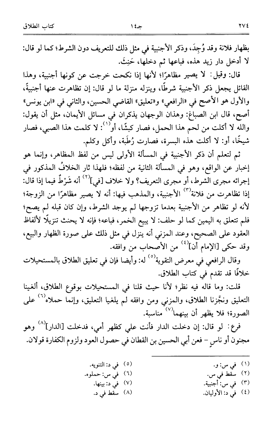 قال: وقيل: لا يصير مظاهراً؛ لأنها إذا نكحت خرجت عن كونها أجنبية، وهذا القائل يجعل ذكر الأجنبية شرطاً، وينزله منزلة ما لو قال: إن تظاهرت عنها أجنبيةً، والأول هو الأصح في "الرافعي" و"تعليق" القاضي الحسين، والثاني في "ابن يونس" أصح، قال ابن الصباغ: وهذان الوجهان يذكران في مسائل الأيمان، مثل أن يقول: والله لا أكلت من لحم هذا الحمل، فصار كبشاً، أو: لا كلمت هذا الصبي، فصار شيخاً، أو: لا أكلت هذه البسرة، فصارت رُطَبة، وأكل وكلم.