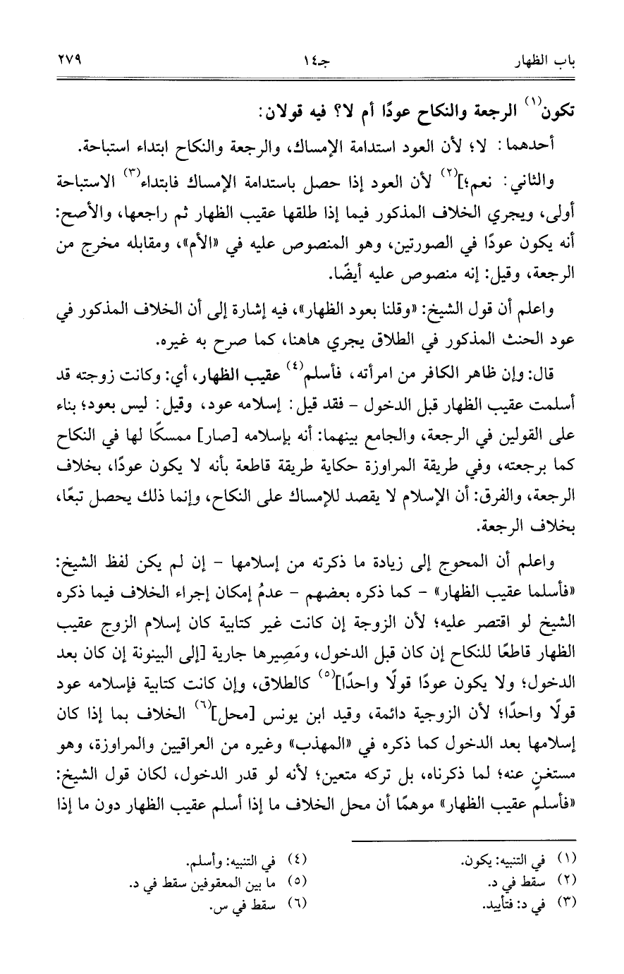 واعلم أن المحوج إلى زيادة ما ذكرته من إسلامها- إن لم يكن لفظ الشيخ: "فأسلمها عقيب الظهار"- كما ذكره بعضهم- عدمُ إمكان إجراء الخلاف فيما ذكره الشيخ لو اقتصر عليه؛ لأن الزوجة إن كانت غير كتابية كان إسلام الزوج عقيب الظهار قاطعاً للنكاح إن كان قبل الدخولن ومَصِيرها جارية [إلى البينونة إن كان بعد الدخول؛ ولا يكون عوداً قولاً واحداً] كالطلاق، وإن كانت كتابية فإسلامه عود قولاً واحداً؛ لأن الزوجية دائمة، وقيد ابن يونس [محل] الخلاف بما إذا كان إسلامها بعد الدخول كما ذكره في "المهذب" وغيره من العراقيين والمراوزة، وهو مستغنٍ عنه؛ لما ذكرناه، بل تركه متعين؛ لأنه لو قدر الدخول، لكان قول الشيخ: "فأسلم عقيب الظهار" موهماً أن محل الخلاف ما إذا أسلم عقيب الظهار دون ما إذا