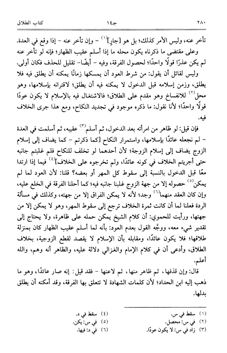 فإن قيل: لو ظاهر من امرأته بعد الدخول، ثم أسلم عقيبه، ثم أسلمت في العدة- لم نجعله عائداً بإسلامها، واستمرار النكاح [كما ذكرتم- كما يضاف إلى إسلام الزوج يضاف إلى إسلام الزوجة؛ لأن أحدهما لو تخلف للنكاح فلم غلبتم جانبه حتى أجريتم الخلاف في كونه عائداً، ولم تخرجوه على الخلاف] فيما إذا ارتدا معاً قبل الدخول بالنسبة إلى سقوط كل المهر أو بعضه؟ قلنا: لأن العود لما لم يمكن حصوله إلا من جهة الزوج غلبنا جانبه فيه؛ كما أحلنا الفرقة في الخلع عليه، وإن كان العقد منهما وجد؛ لأنه لا يمكن الفراق إلا من جهته، وكذلك في مسألة الردة فعلنا لما أن كانت ثمرة الخلاف ترجع إلى سقوط المهر، وهو لا يمكن إلا من جهتها، ورأيت للحموي: أن كلام الشيخ يمكن حمله على ظاهرة، ولا يحتاج إلى تقدير شيء معه، ووجَّه القول بعدم العود: بأنه لما أسلم عقيب الظهار كان بمنزلة طلاقها؛ فلا يكون عائداً، ومقابله بأن الإسلام لا يقصد لقطع الزوجية، بخلاف الطلاق، وأدعى أن في كلام الإمام والغزالي دلالة عليه، والظاهر أنه وهم، والله أعلم.