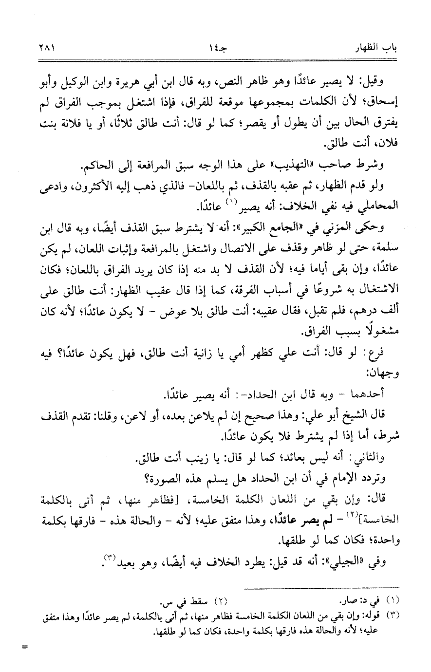 وحكى المزني في "الجامع الكبير": أنه لا يشترط سبق القذف أيضاً، وبه قال ابن سلمة، حتى لو ظاهر وقذف على الاتصال واشتغل بالمرافعة وإثبات اللعان، لم يكن عائداًن وإن بقى أياماً فيه؛ لأن القذف لابد منه إذا كان يريد الفراق باللعان؛ فكان الاشتغال به شروعاً في أسباب الفرقة، كما إذا قال عقيب الظهار: أنت طالق على ألف درهم، فلم تقبل، فقال عقيبه: أنت طالق بلا عوض- لا يكون عائداً؛ لأنه كان مشغولاً بسبب الفراق.
