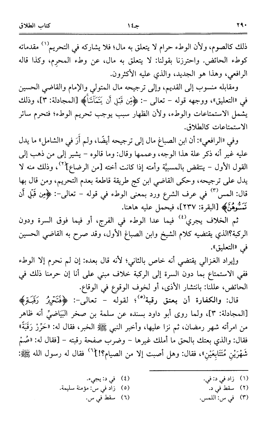 قال: والكفارة أن يعتق رقبة؛ لقوله- تعالى-: {فَتَحْرِيرُ رَقَبَةٍ} [المجادلة: 3]، ولما روى أبو داود بسنده عن سلمة بن صخر البَيَاضيِّ أنه ظاهر من امرأته شهر رمضان، ثم نزا عليها، وأخبر النبي صلى الله عليه وسلم الخبر، فقال له: "حَرِّرْ رَقَبَةً" فقال: والذي بعتك بالحق ما أملك غيرها- وضرب صفحة رقبته-[فقال له: "صُمْ شَهْرَيْنِ مُتَتَابِعَيْنِ"، فقال: وهل أصبت إلا من الصيام؟!] فقال له رسول الله صلى الله عليه وسلم: