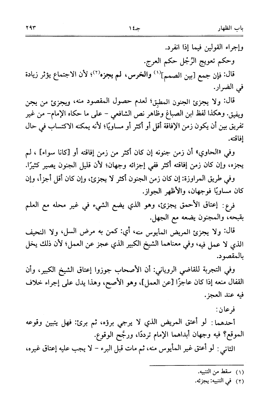 قال: ولا يجزئ الجنون المطبِق؛ لعدم حصول المقصود منه، ويجزئ من يجن ويفيق. وهكذا لفظ ابن الصباغ وظاهر نص الشافعي- على ما حكاه الإمام- من غير تفريق بين أن يكون زمن الإفاقة أقل أو أكثر أو مساوياً؛ لأنه يمكنه الاكتساب في حال إفاقته.