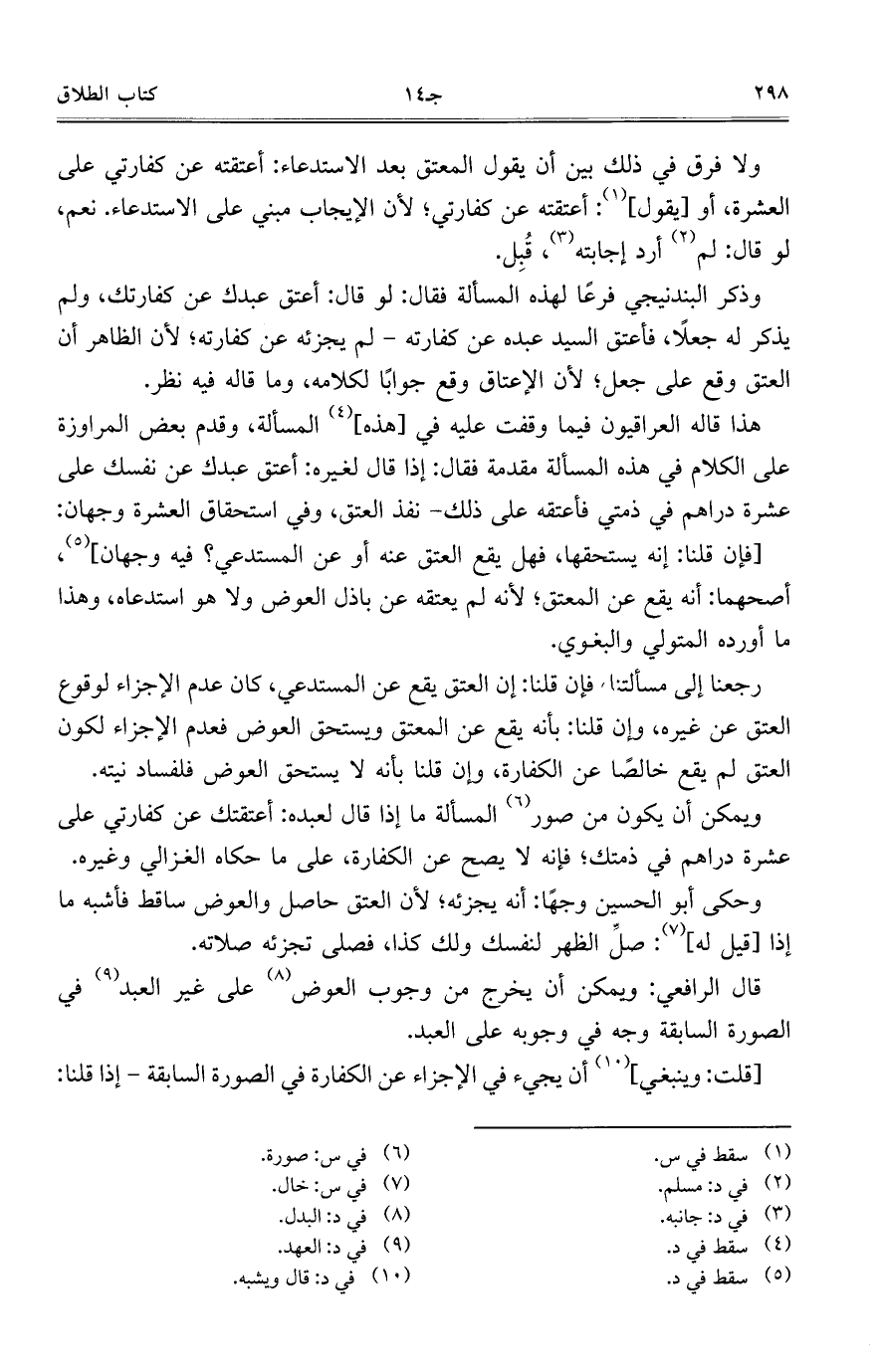 ولا فرق في ذلك بين أن يقول المعتق بعد الاستدعاء: أعتقته عن كفارتي على العشرة، أو [يقول]: أعتقته عن كفارتي؛ لأن الإيجاب مبني على الاستدعاء. نعم، لو قال: لم أرد إجابته، قُبِل.