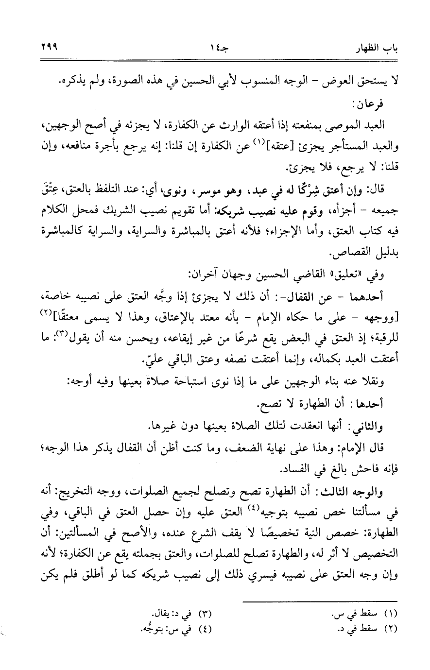 والوجه الثالث: أن الطهارة تصح وتصلح لجميع الصلوات، ووجه التخريج: أنه في مسألتنا خص نصيبه بتوجيه العتق عليه وإن حصل العتق في الباقي، وفي الطهارة: خصص النية تخصيصاً لا يقف الشرع عنده، والأصح في المسألتين: أن التخصيص لا أثر له، والطهارة تصلح للصلوات، والعتق بجملته يقع عن الكفارة؛ لأنه وإن وجه العتق على نصيبه فيسري ذلك إلى نصيب شريكه كما لو أطلق فلم يكن