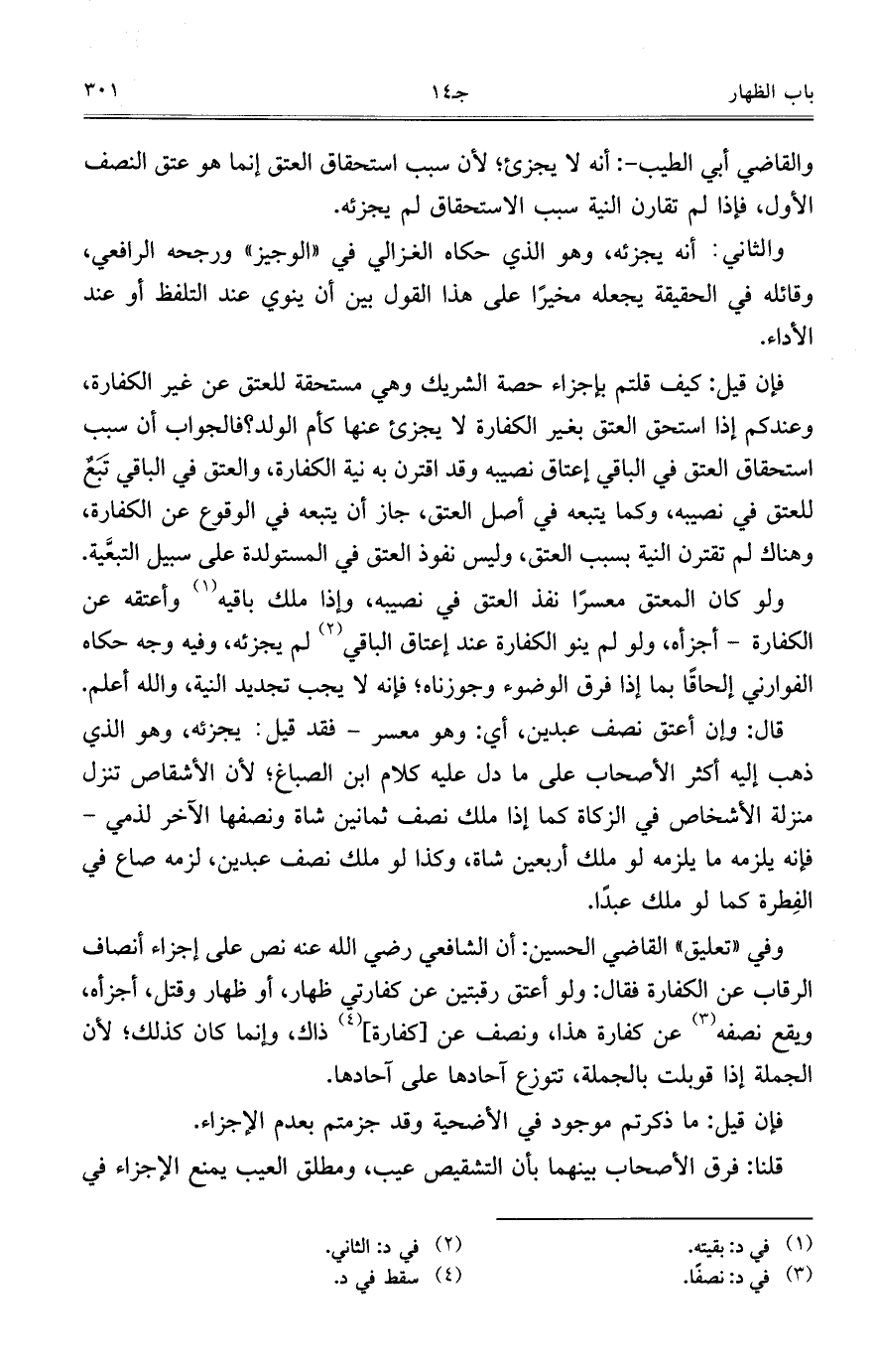 وفي "تعليق" القاضي الحسين: أن الشافعي رضي الله عنه نص على إجزاء أنصاف الرقاب عن الكفارة فقال: ولو أعتق رقبتين عن كفارتي ظهار، أو ظهار وقتل، أجزأه، ويقع نصفه عن كفارة هذا، ونصف عن [كفارة] ذاك، وإنما كان كذلك؛ لأن الجملة إذا قوبلت بالجملة، تتوزع آحادها على آحادها.
