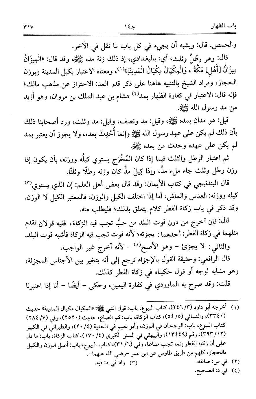 قيل: هو مدان بمده صلى الله عليه وسلم، وقيل: مد ونصف، وقيل: مد وثلث، ورد أصحابنا ذلك بأن ذلك لم يكن على عهد رسول الله صلى الله عليه وسلم وإنما أُحْدِثَ بعده، ولا يجوز أن يعتبر بمد لم يكن على عهده وحدث من بعده صلى الله عليه وسلم.