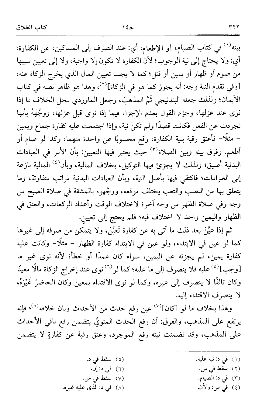 بينه في كتاب الصيام، أو الإطعام، أي: عند الصرف إلى المساكين، عن الكفارة، أي: ولا يحتاج إلى نية الوجوب؛ لأن الكفارة لا تكون إلا واجبة، ولا إلى تعيين سببها من صوم أو ظهار أو يمين أو قتل؛ كما لا يجب تعيين المال الذي يخرج الزكاة عنه، [وفي تقدم النية وجه: أنه يجوز كما هو في الزكاة]، وهذا هو ظاهر نصه في كتاب الأيمان؛ ولذلك جعله البندنيجي ثَمَّ المذهبَ، وجعل الماوردي محل الخلاف ما إذا نوى عند عزلها، وجزم القول بعدم الإجزاء فيما إذا نوى قبل عزلها، ووجَّهَهُ بأنها تجردت عن الفعل فكانت قصداً ولم تكن نية، وإذا اجتمعت عليه كفارة جماع ويمين- مثلاً- فأعتق رقبة بنية الكفارة، وقع محسوباً عن واحدة منهما، وكذا لو صام أو أطعم. وفرق بينه وبين الصلاة حيث يعتبر فيها التعيين: بأن الأمر في العبادات البدنية أضيق؛ ولذلك لا يجزئ فيها التوكيل، بخلاف المالية، وبأن المالية نازعة إلى الغرامات؛ فاكتفي فيها بأصل النية، وبأن العبادات البدنية مراتب متفاوتة، وما يتعلق بها من النصب والتعب يختلف موقعه، ووجَّهوه بالمشقة في صلاة الصبح من وجه وفي صلاة الظهر من وجه آخر؛ لاختلاف الوقت وأعداد الركعات، والعتق في الظهار واليمين واحد لا اختلاف فيه؛ فلم يحتج إلى تعيين.