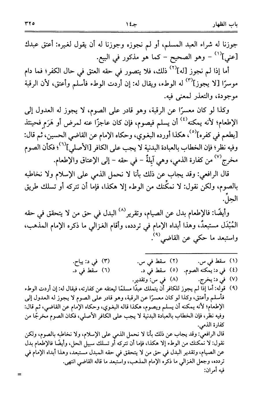 وكذا لو كان معسراً عن الرقبة، وهو قادر على الصوم، لا يجوز له العدول إلى الإطعام؛ لأنه يمكنه أن يسلم فيصوم، فإن كان عاجزاً عنه لمرض أو هَرَمٍ فحينئذ [يطعم في كفره]، هكذا أورده البغوي، وحكاه الإمام عن القاضي الحسين، ثم قال: وفيه نظر؛ فإن الخطاب بالعبادة البدنية لا يجب على الكافر [الأصلي]؛ فكأنا لصوم مخرج من كفارة الذمي، وهي آيِلةٌ- في حقه- إلى الإعتاق والإطعام.