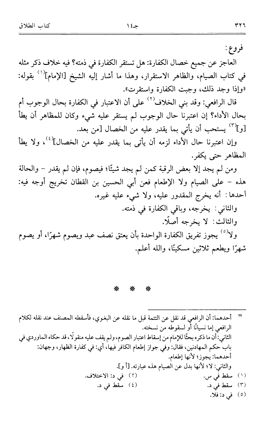 قال الرافعيك وقد بني الخلاف على أن الاعتبار في الكفارة بحال الوجوب أم بحال الأداء؟ إن اعتبرنا حال الوجوب لم يستقر عليه شيء وكان للمظاهر أن يطأ [و] يستحب أن يأتي بما يقدر عليه من الخصال [من بعد.
