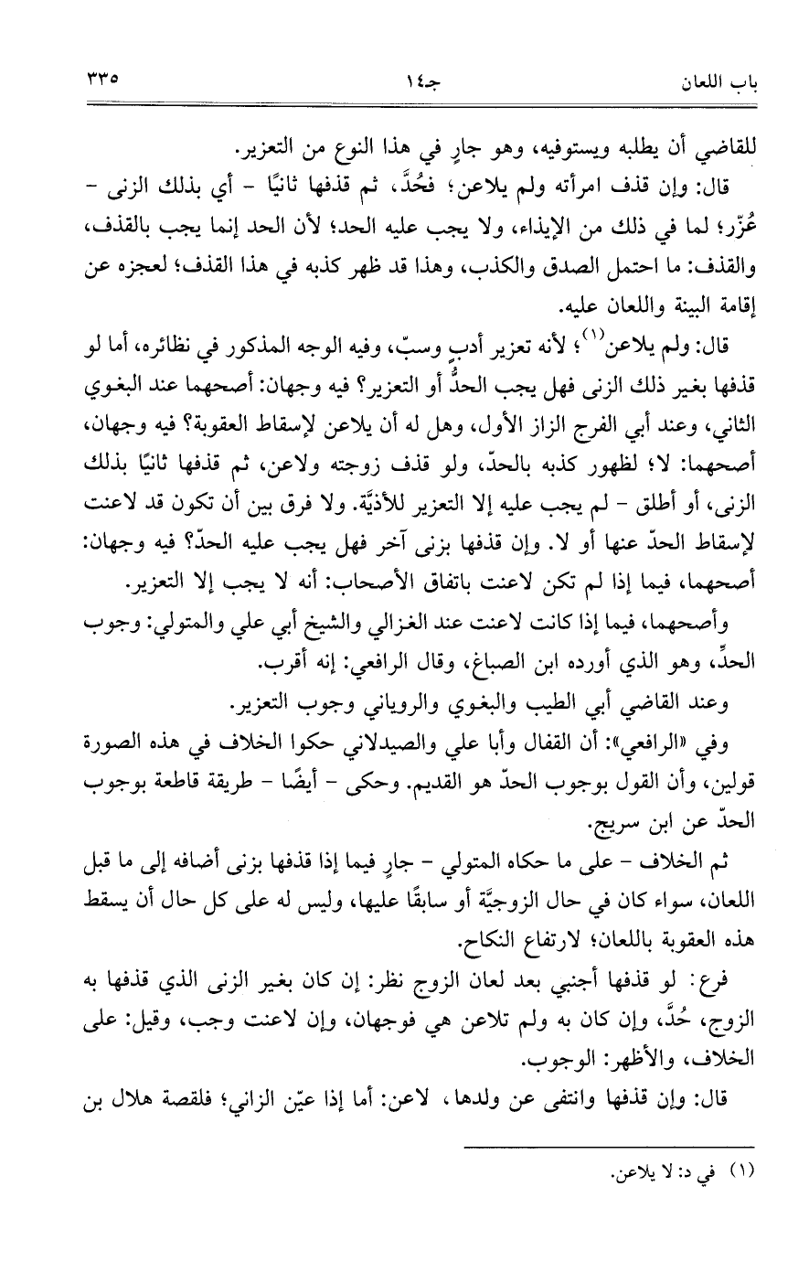قال: ولم يلاعن؛ لأنه تعزير أدبٍ وسبّ، وفيه الوجه المذكور في نظائره، أما لو قذفها بغير ذلك الزنى فهل يجب الحدُّ أو التعزير؟ فيه وجهان: أصحهما عند البغوي الاثني، وعند أبي الفرج الزاز الأول، وهل له أن يلاعن لإسقاط العقوبة؟ فيه وجهان، أصحهما: لا؛ لظهور كذبه بالحدّ، ولو قذف زوجته ولاعن، ثم قذفها ثانياً بذلك الزنى، أو أطلق- لم يجب عليه إلا التعزير للأذيَّة. ولا فرق بين أن تكون قد لاعنت لإسقاط الحدّ عنها أو لا. وإن قذفها بزنى آخر فهل يجب عليه الحدّ؟ فيه وجهان: أصحهما، فيما إذا لم تكن لاعنت باتفاق الأصحاب: أنه لا يجب إلا التعزير.