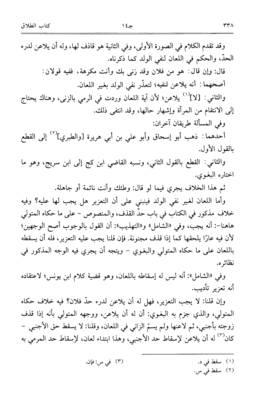 وأما اللعان لغير نفي الولد فينبني على أن التعزير هل يجب لها عليه؟ وفيه خلاف مذكور في الكتاب في باب حدِّ القذف، والمنصوص- على ما حكاه المتولي ها هنا-: أنه يجب، وفي "الشامل" و"التهذيب": أن القول بالوجوب أصح الوجهين؛ لأن فيه عاراً يلحقها كما إذا قذف مجنونة. فإن قلنا يجب عليه التعزير، فله أن يسقطه باللعان على ما حكاه المتولي والبغوي- ويتجه أن يجري فيه الوجه المذكور في نظائره.