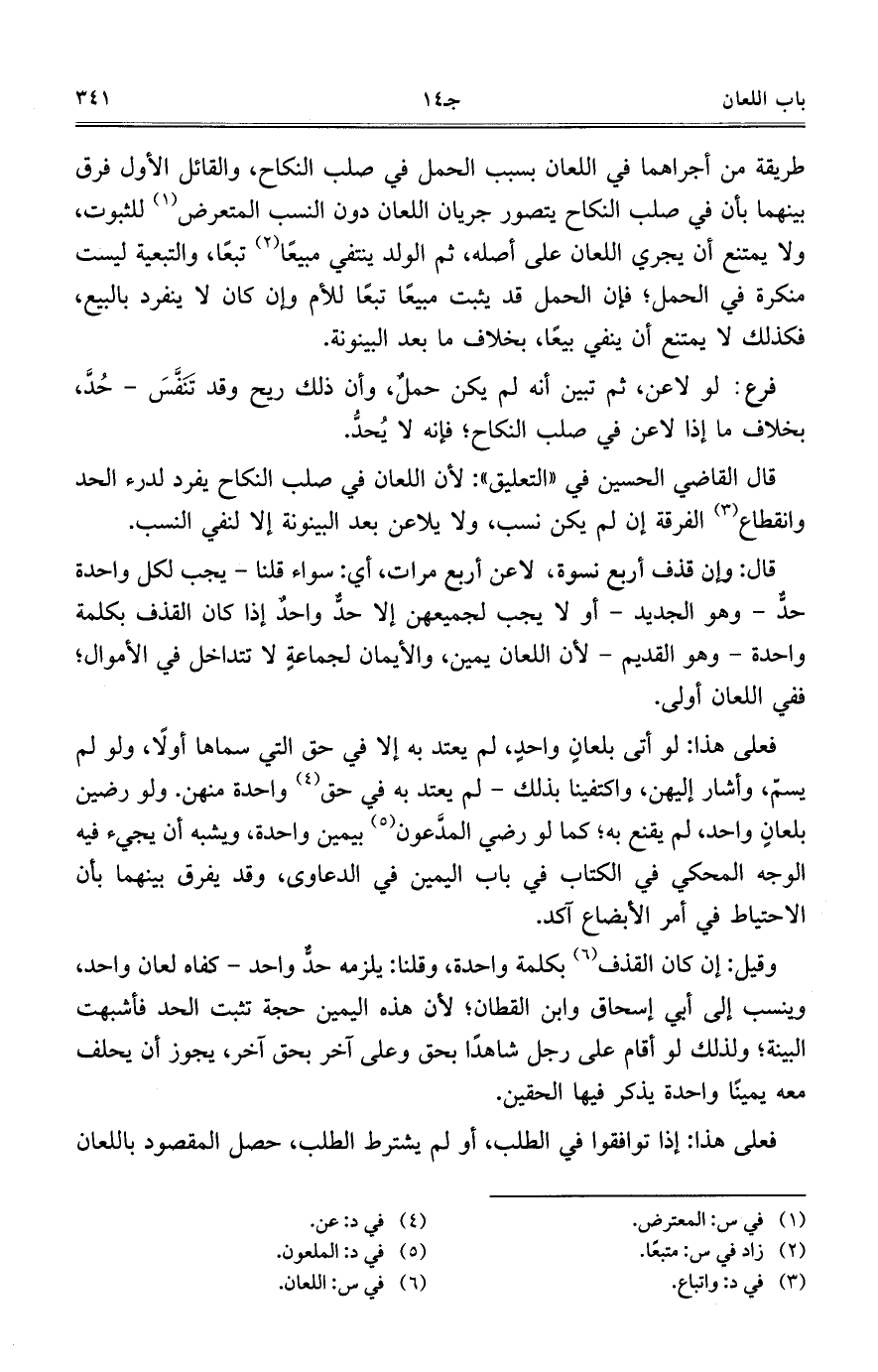 طريقة من أجراهما في اللعان بسبب الحمل في صلب النكاح، والقائل الأول فرق بينهما بأن في صلب النكاح يتصور جريان اللعان دون النسب المتعرض للثبوت، ولا يمتنع أن يجري اللعان على أصله، ثم الولد ينتفي مبيعاً تبعاً، والتبعية ليست منكرة في الحمل؛ فإن الحمل قد يثبت مبيعاً تبعاً للأم وإن كان لا ينفرد بالبيع، فكذلك لا يمتنع أن ينفي بيعاً، بخلاف ما بعد البينونة.