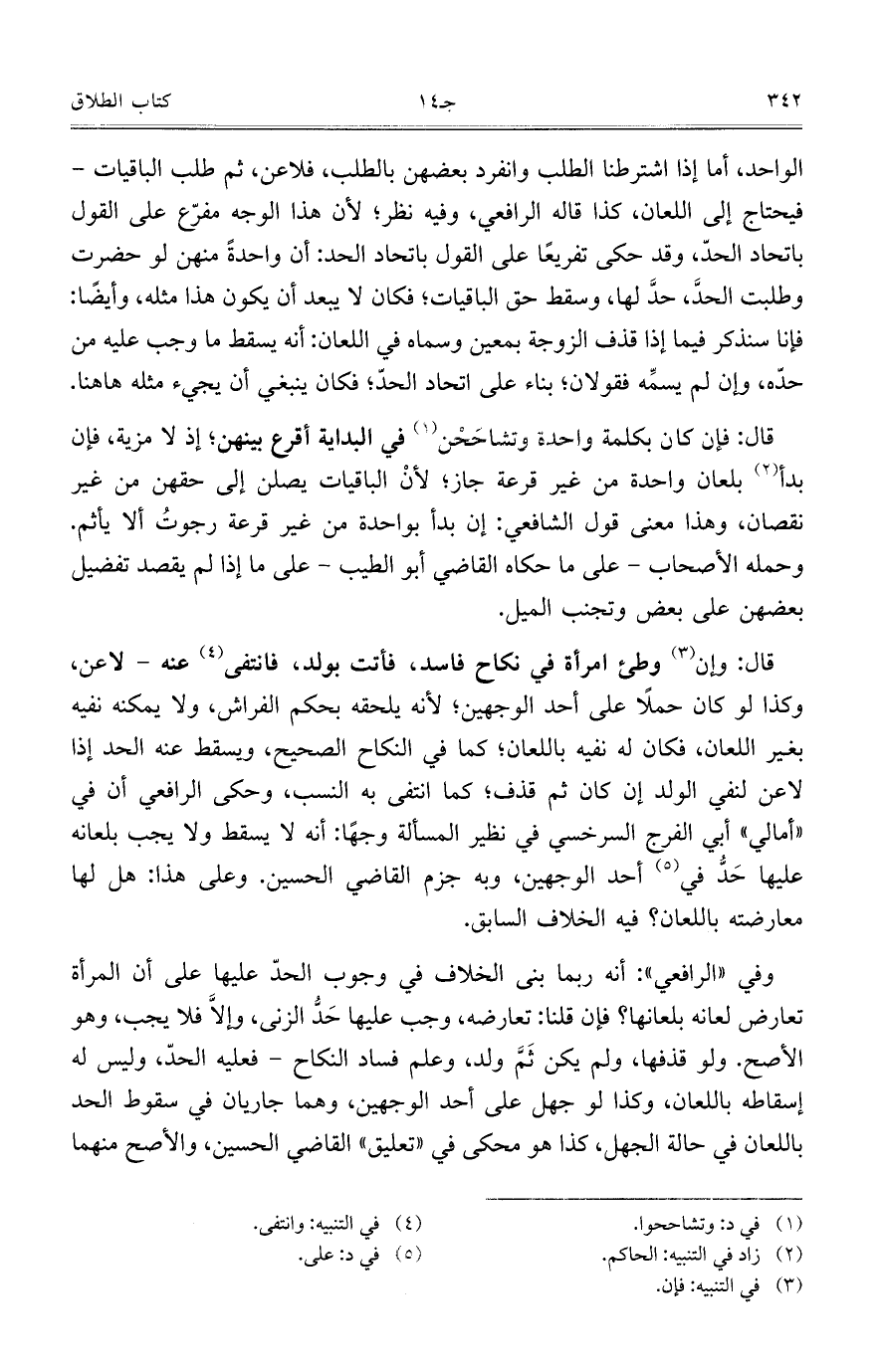 الواحد، أما إذا اشترطنا الطلب وانفرد بعضهن بالطلب، فلاعن، ثم طلب الباقيات- فيحتاج إلى اللعان، كذا قاله الرافعي، وفيه نظر؛ لأن هذا الوجه مفرّع على القول باتحاد الحدّ، وقد حكى تفريعاً على القول باتحاد الحد: أن واحدةً منهن لو حضرت وطلبت الحدَّ، حدَّ لها، وسقط حق الباقيات؛ فكان لا يبعد أن يكون هذا مثله، وأيضاً: فإنا سنذكر فيما إذا قذف الزوجة بمعين وسماه في اللعان: أنه يسقط ما وجب عليه من حدّه، وإن لم يسمِّه فقولان؛ بناءً على اتحاد الحدّ؛ فكان ينبغي أن يجيء مثله ها هنا.