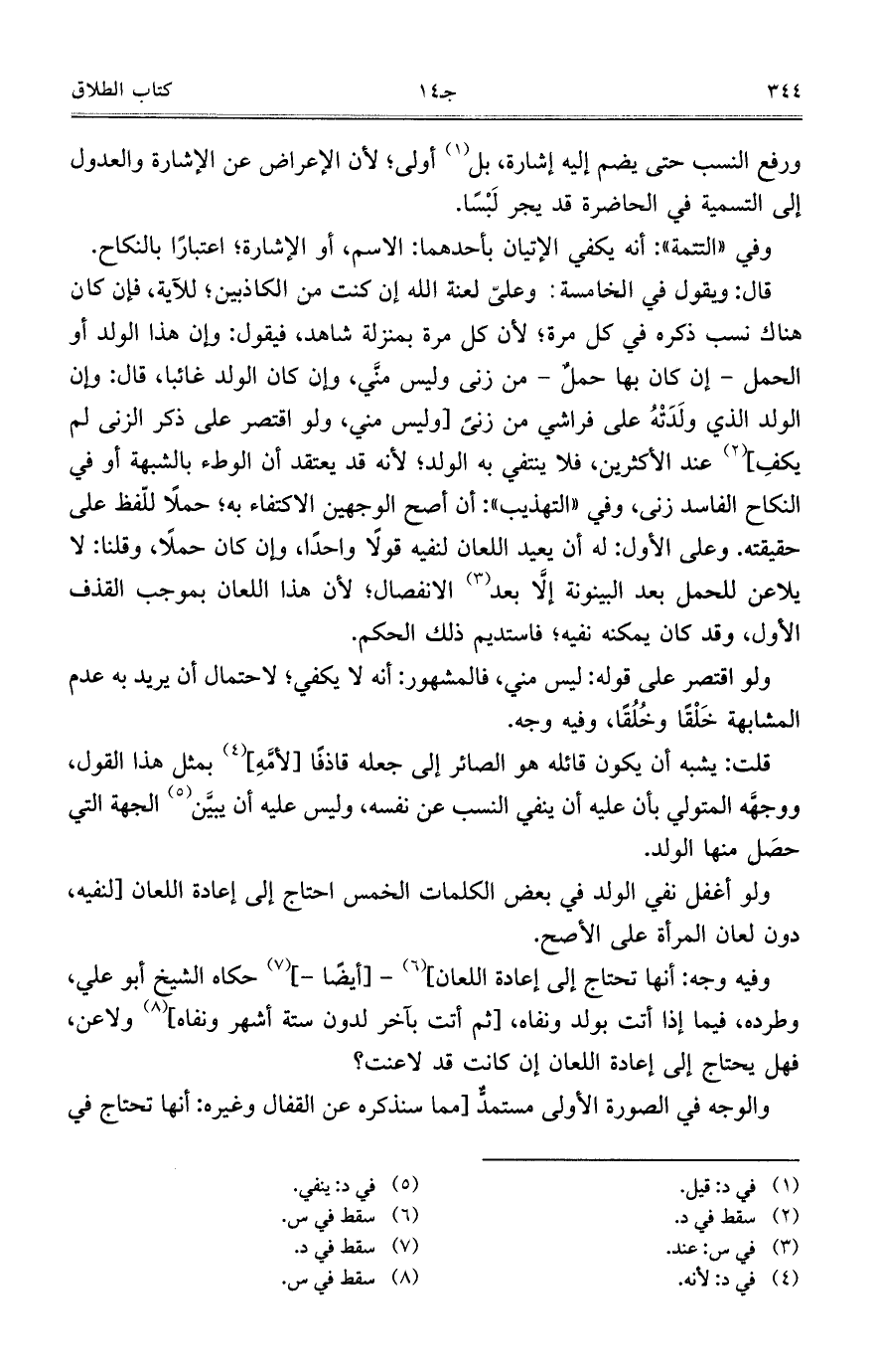 قال: ويقول في الخامسة: وعليّ لعنة الله إن كنت من الكاذبين؛ للآية، فإن كان هناك نسب ذكره في كل مرة؛ لأن كل مرة بمنزلة شاهد، فيقول: وإن هذا الولد أو الحمل- إن كان بها حملٌ- من زنى وليس منَّي، وإن كان الولد غائباً، قال: وإن الولد الذي ولَدَتْهُ على فراشي من زنىً [وليس مني، ولو اقتصر على ذكر الزنى لم يكفِ] عند الأكثرين، فلا ينتفي به الولد؛ لأنه قد يعتقد أن الوطء بالشبهة أو في النكاح الفاسد زنى، وفي "التهذيب": أن أصح الوجهين الاكتفاء به؛ حملاً للّفظ على حقيقته. وعلى الأول: له أن يعيد اللعان لنفيه قولاً واحداً، وإن كان حملاً، وقلنا: لا يلاعن للحمل بعد البينونة إلَّا بعد الانفصال؛ لأن هذا اللعان بموجب القذف الأول، وقد كان يمكنه نفيه؛ فاستديم ذلك الحكم.