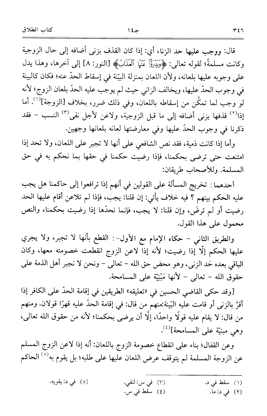 قال: ووجب عليها حد الزنا، أي: إذا كان القذف بزنى أضافه إلى حال الزوجية وكانت مسلمةً؛ لقوله تعالى: {وَيَدْرَأُ عَنْهَا الْعَذَابَ} [النور: 8] إلى آخرها، وهذا يدل على وجوبه عليها بلعانه، ولأن اللعان بمنزلة البيّنة في إسقاط الحدّ عنه؛ فكان كالبينة في وجوب الحدّ عليها، ويخالف الزاني حيث لم يوجب عليه الحدّ بلعان الزوج؛ لأنه لو وجب لما تمكَّن من إسقاطه باللعان، وفي ذلك ضرر، بخلاف [الزوجة]. أما إذا قذفها بزنى أضافه إلى ما قبل الزوجية، ولاعن لأجل نفي النسب- فقد ذكرنا في وجوب الحدّ عليها وفي معارضتها لعانه بلعانها وجهين.