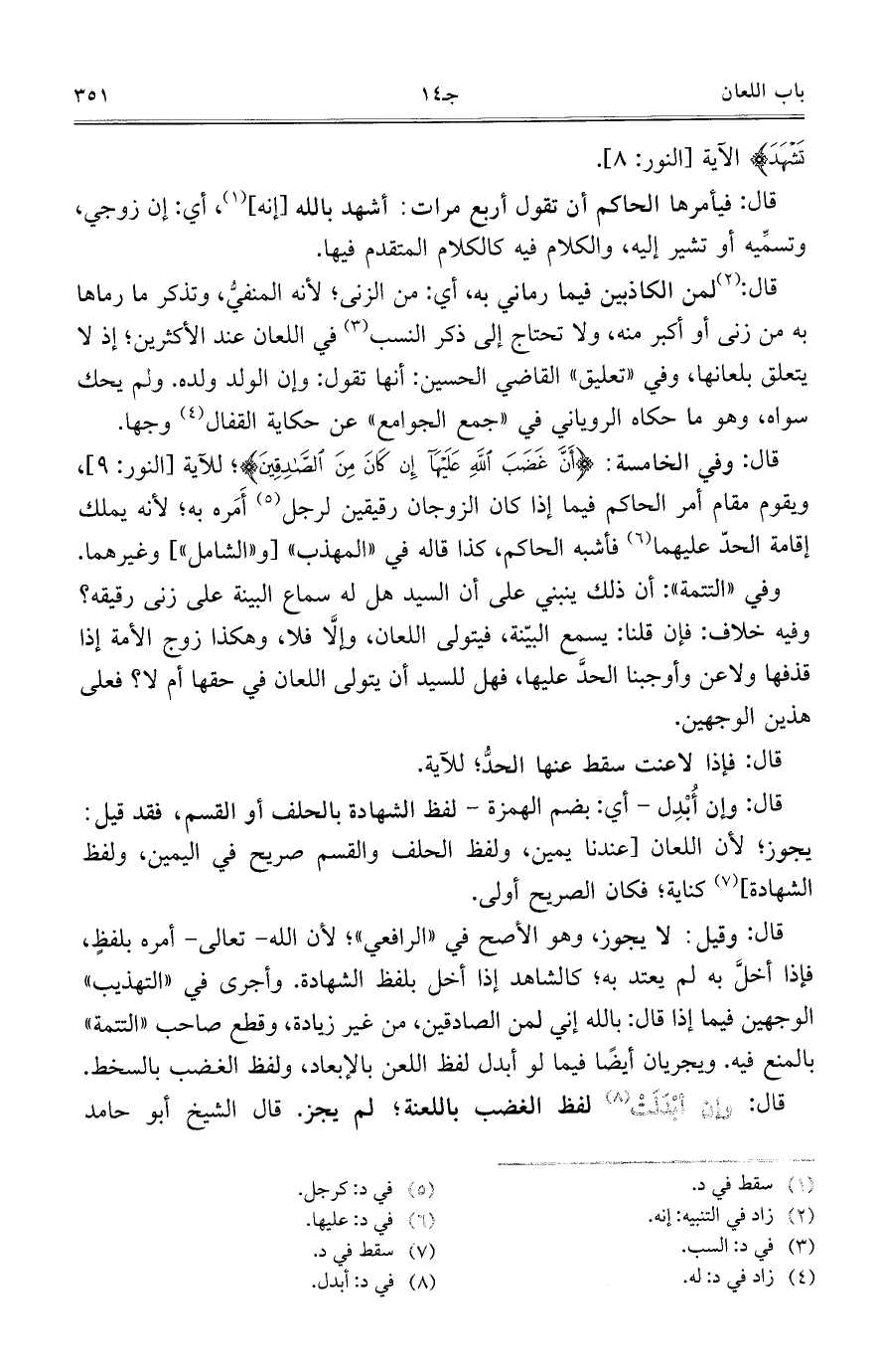 قال: وفي الخامسة: {أَنَّ غَضَبَ اللَّهِ عَلَيْهَا إِنْ كَانَ مِنْ الصَّادِقِينَ}؛ للآية [النور: 9]، ويقوم مقام أمر الحاكم فيما إذا كان الزوجان رقيقين لرجل أَمَره به؛ لأنه يملك إقامة الحدّ عليهما فأشبه الحاكم، كذا قاله في "المهذب" [و"الشامل"] وغيرهما.