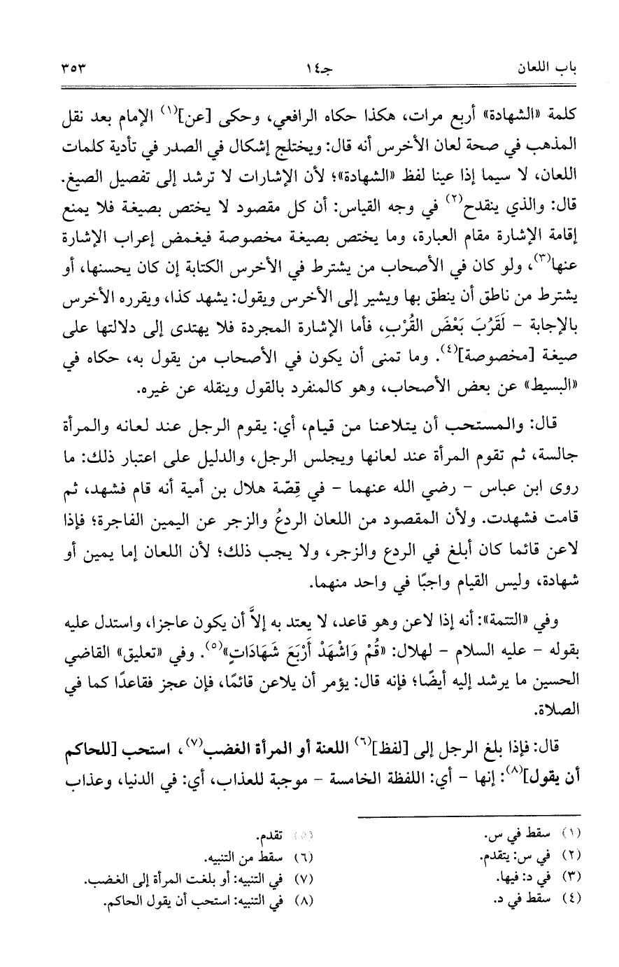 كلمة "الشهادة" أربع مرات، هكذا حكاه الرافعي، وحكى [عن] الإمام بعد نقل المذهب في صحة لعان الأخرس أنه قال: ويختلج إشكال في الصدر في تأدية كلمات اللعان، لاسيما إذا عينا لفظ "الشهادة"؛ لأن الإشارات لا ترشد إلى تفصيل الصيغ. قال: والذي ينقدح في وجه القياس: أن كل مقصود لا يختص بصيغة فلا يمنع إقامة الإشارة مقام العبارة، وما يختص بصيغة مخصوصة فيغمض إعراب الإشارة عنها، ولو كان في الأصحاب من يشترط في الأخرس الكتابة إن كان يحسنها، أو يشترط من ناطق أن ينطق بها ويشير إلى الأخرس ويقول: يشهد كذا، ويقرره الأخرس بالإجابة- لَقَرُبَ بَعْضَ القُرْبِ، فأما الإشارة المجردة فلا يهتدي إلى دلالتها على صيغة [مخصوصة]. وما تمنى أن يكون في الأصحاب من يقول به، حكاه في "البسيط" عن بعض الأصحاب، وهو كالمنفرد بالقول وينقله عن غيره.