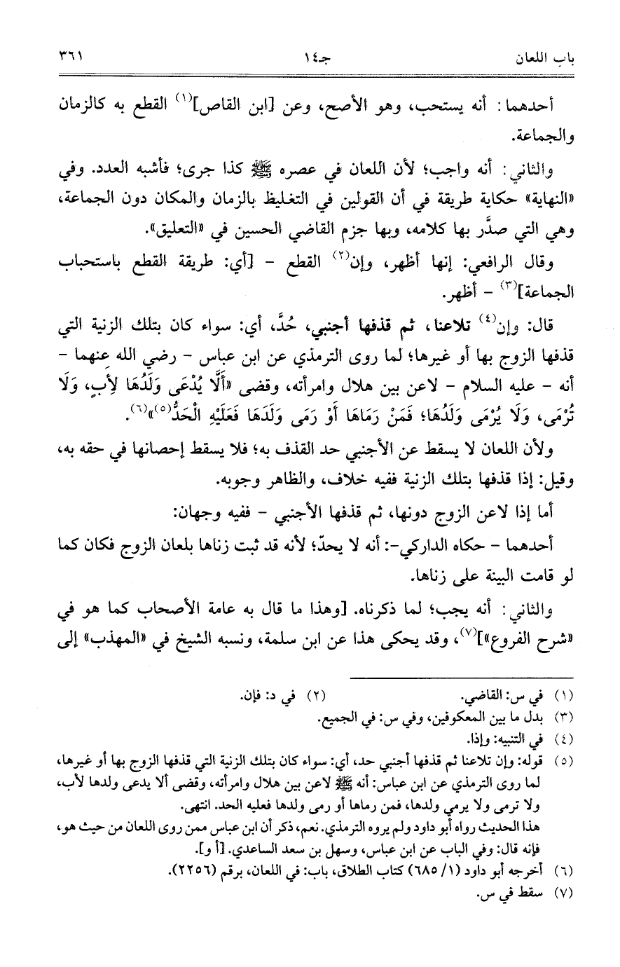 والثاني: أنه واجب؛ لأن اللعان في عصره صلى الله عليه وسلم كذا جرى؛ فأشبه العدد. وفي "النهاية" حكاية طريقة في أن القولين في التغليظ بالزمان والمكان دون الجماعة، وهي التي صدَّر بها كلامه، وبها جزم القاضي الحسين في "التعليق".