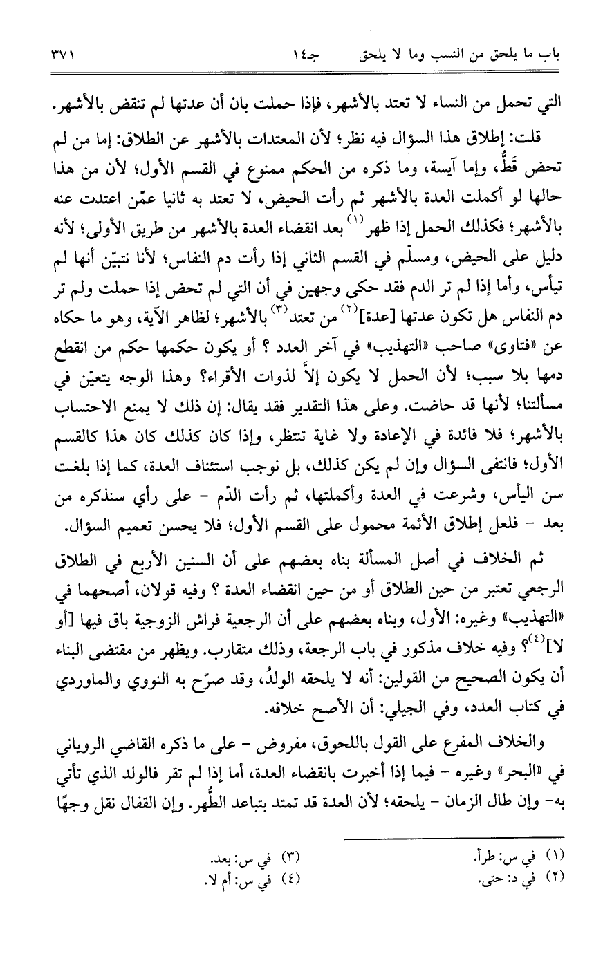 قلت: إطلاق هذا السؤال فيه نظر؛ لأن المعتدات بالأشهر عن الطلاق: إما من لم تحض قَطُّ، وإما آيسة، وما ذكره من الحكم ممنوع في القسم الأول؛ لأن من هذا حالها لو أكملت العدة بالأشهر ثم رأت الحيض، لا تعتد به ثانياً عمّن اعتدت عنه بالأشهر؛ فكذلك الحمل إذا ظهر بعد انقضاء العدة بالأشهر من طريق الأولى؛ لأنه دليل على الحيض، ومسلّم في القسم الثاني إذا رأت دم النفاس؛ لأنا نتبيّن أنها لم تيأس، وأما إذا لم تر الدم فقد حكى وجهين في أن التي لم تحض إذا حملت ولم تر دم النفاس هل تكون عدتها [عدة] من تعتد بالأشهر؛ لظاهر الآية، وهو ما حكاه عن "فتاوى" صاحب "التهذيب" في آخر العدد؟ أو يكون حكمها حمك من انقطع دمها بلا سبب؛ لأن الحمل لا يكون إلَّا لذوات الأقراء؟ وهذا الوجه يتعيّن في مسألتنا؛ لأنها قد حاضت. وعلى هذا التقدير فقد يقال: إن ذلك لا يمنع الاحتساب بالأشهر؛ فلا فائدة في الإعادة ولا غاية تنتظر، وإذا كان كذلك كان هذا كالقسم الأول؛ فانتفى السؤال وإن لم يكن كذلك، بل نوجب استئناف العدة، كما إذا بلغت سن اليأس، وشرعت في العدة وأكملتها، ثم رأت الدّم- على رأي سنذكره من بعد- فلعل إطلاق الأئمة محمول على القسم الأولح فلا يحسن تعميم السؤال.