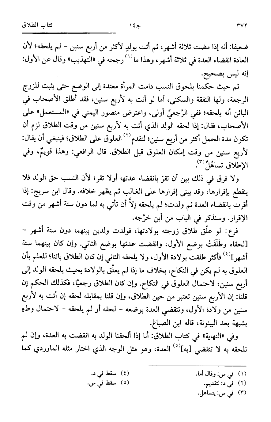 ضعيفاً: أنه إذا مضت ثلاثة أشهر، ثم أتت بولدٍ لأكثر من أربع سنين- لم يلحقه؛ لأن العادة انقضاء العدة في ثلاثة أشهر، وهذا ما رجحه في "التهذيب" وقال عن الأول: إنه ليس بصحيح.