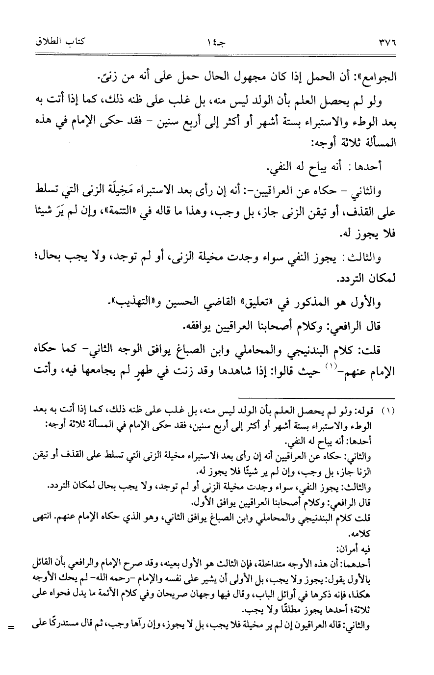 قلت: كلام البندنيجي والمحاملي وابن الصباغ يوافق الوجه الثاني- كما حكاه الإمام عنهم- حيث قالوا: إذا شاهدها وقد زنت في طهرٍ لم يجامعها فيه، وأتت