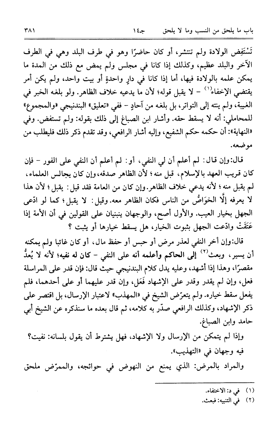 قال: وغن قال: لم أعلم أن لي النفي، أو: لم أعلم أن النفي على الفور- فإن كان قريب العهد بالإسلام، قبل منه؛ لأن الظاهر صدقه، وإن كان يجالس العلماء، لم يقبل منه؛ لأنه يدعي خلاف الظاهر. وإن كان من العامة فقد قيل: يقبل؛ لأن هذا لا يعرفه إلَّا الخوَاصُّ من الناس فكان الظاهر معه. وقيل: لا يقبل؛ كما لو ادّعى الجهل بخيار العيب. والأول أصح، والوجهان ينبنيان على القولين في أن الأمة إذا عَتَقَتْ وادّعت الجهل بثبوت الخيار، هل يسقط خيارها أو يثبت؟