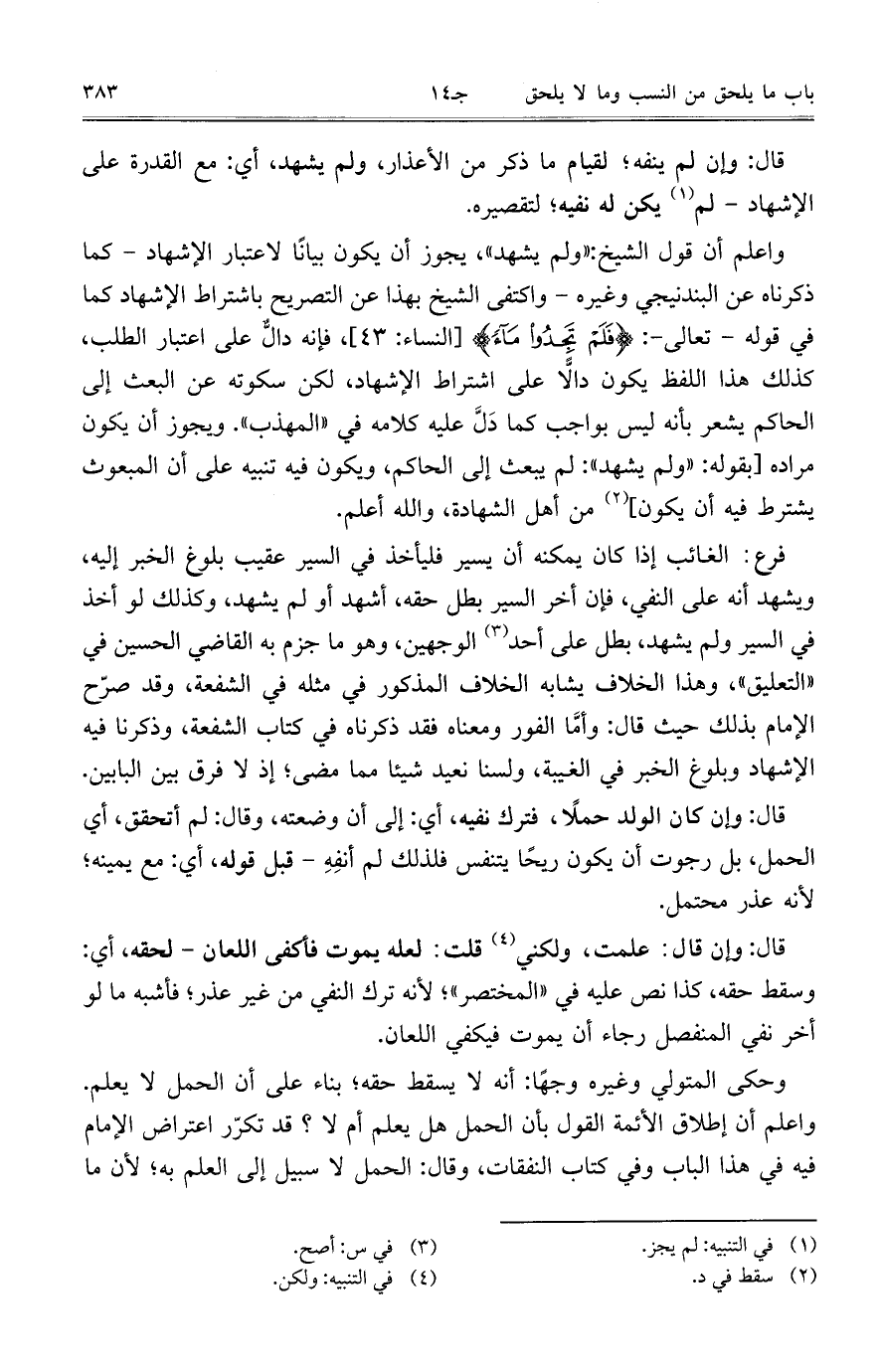 واعلم أن قول الشيخ: "ولم يشهد"، يجوز أن يكون بياناً لاعتبار الإشهاد- كما ذكرناه عن البندنيجي وغيره- واكتفى الشيخ بهذا عن التصريح باشتراط الإشهاد كما في قوله- تعالى-: {فَلَمْ تَجِدُوا مَاءً} [النساء: 43]، فإنه دالٌّ على اعتبار الطلب، كذلك هذا اللفظ يكون دالّاً على اشتراط الإشهاد، لكن سكوته عن البعث إلى الحاكم يشعر بأنه ليس بواجب كما دَلَّ عليه كلامه في "المهذب". ويجوز أن يكون مراده [بقوله: "ولم يشهد": لم يبعث إلى الحاكم، ويكون فيه تنبيه على أن المبعوث يشترط فيه أن يكون] من أهل الشهادة، والله أعلم.