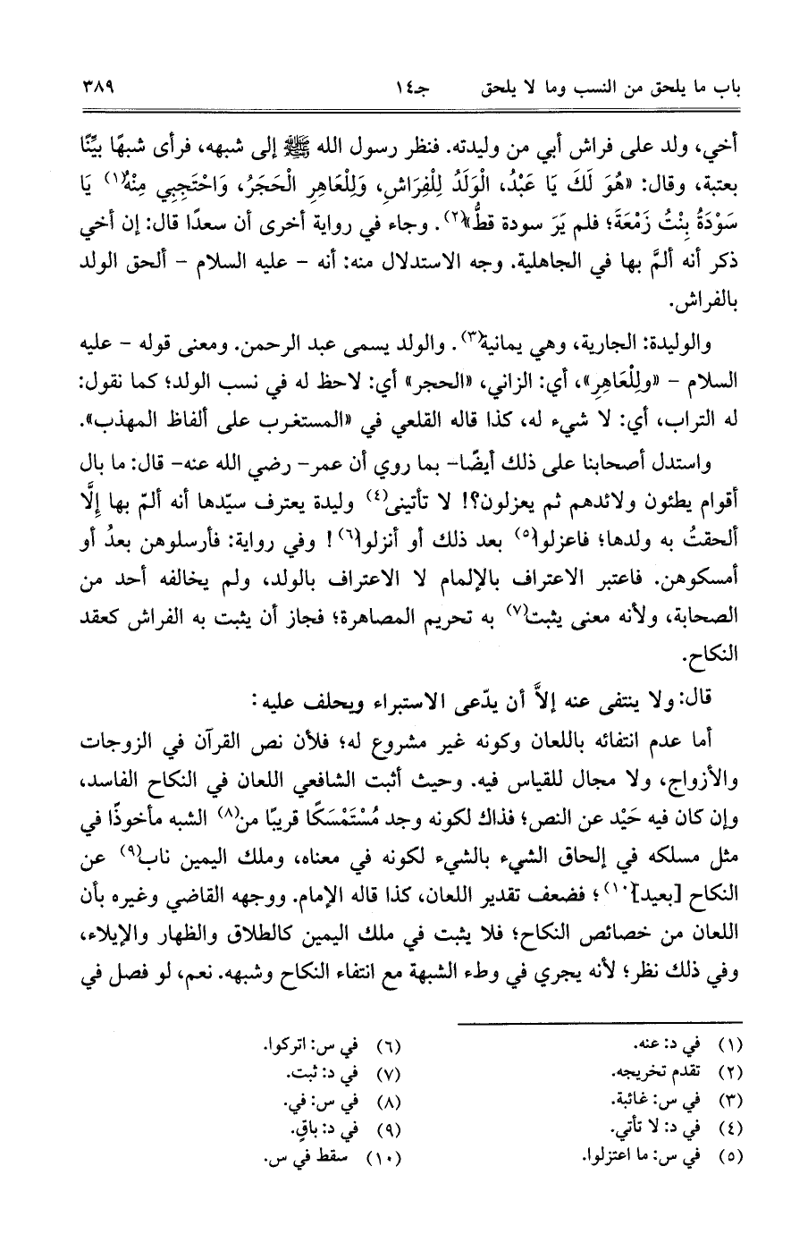 أخي، ولد على فراش أبي من وليدته. فنظر رسول الله صلى الله عليه وسلم إلى شبهه، فرأى شبهاً بيِّناً بعتبة، وقال: "هُوَ لَكَ يَا عَبْدُ، الْوَلَدُ لِلْفِرَاشِ، وَلِلْعَاهِرِ الْحَجَرُ، وَاحْتَجِبِي مِنْهُ يَا سَوْدَةُ بِنْتُ زَمْعَةَ؛ فلم يَرَ سودة قطُّ". وجاء في رواية أخرى أن سعداً قال: إن أخي ذكر أنه ألمَّ بها في الجاهلية. وجه الاستدلال منه: أنه- عليه السلام- ألحق الولد بالفراش.