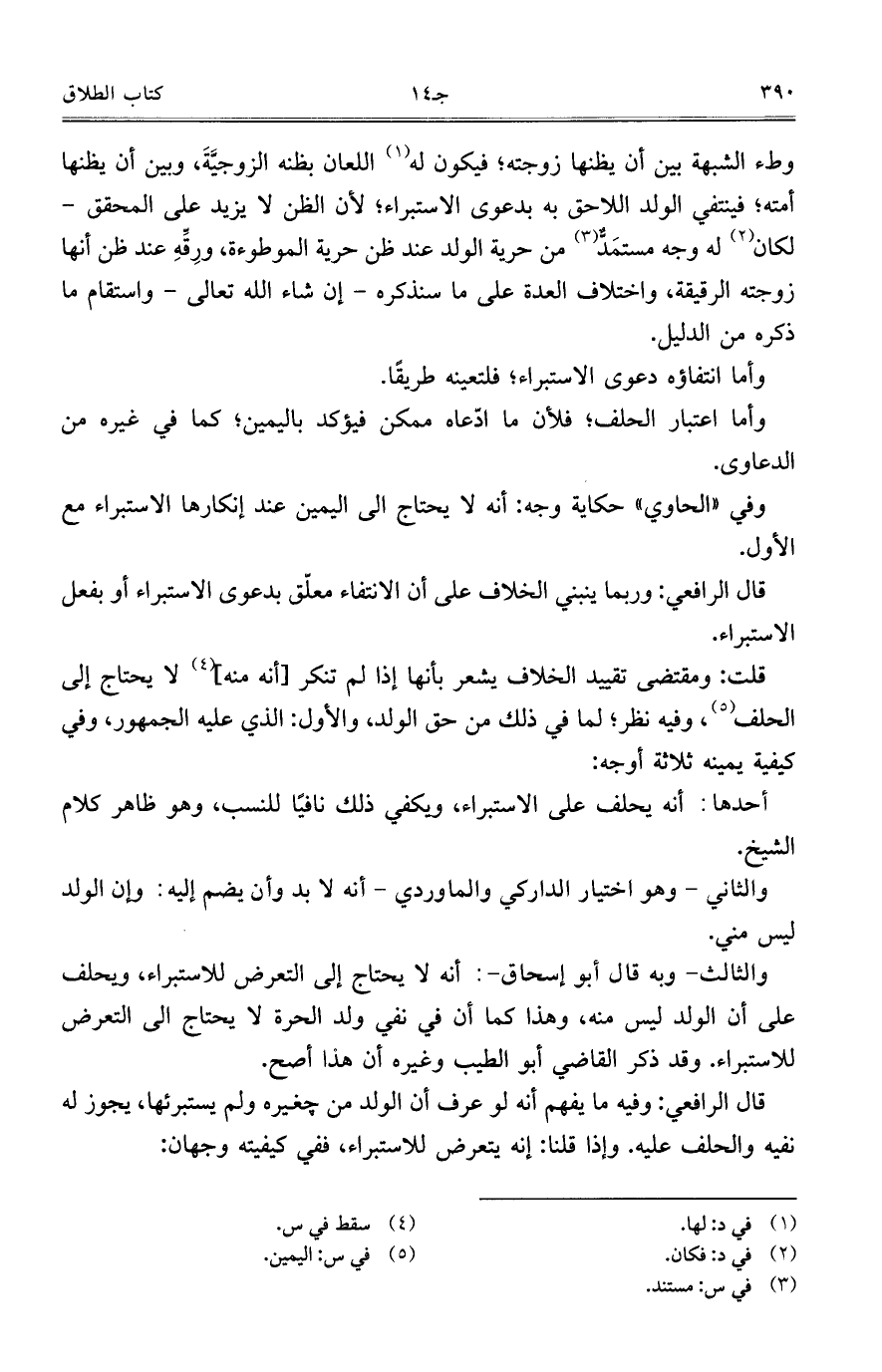 وطء الشبهة بين أن يظنها زوجته؛ فيكون له اللعان بظنه الزوجيَّةَ، وبين أن يظنها أمته؛ فينتفي الولد اللاحق به بدعوى الاستبراء؛ لأن الظن لا يزيد على المحقق- لكان له وجه مستمَدٌّ من حرية الولد عند ظن حرية الموطوءة، ورِقِّهِ عند ظن أنها زوجته الرقيقة، واختلاف العدة على ما سنذكره- إن شاء الله تعالى- واستقام ما ذكره من الدليل.