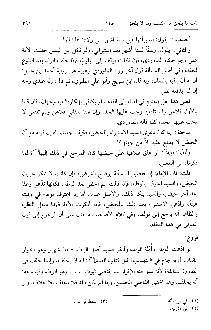 والثاني: يقول: ولدَتْهُ لستة أشهر بعد استبرائي. ولو نكل عن اليمين حلفت الأمة على وجهٍ حكاه الماوردي، فإن نكلت توقفنا إلى البلوغ، فإذا حلف الولد بعد البلوغ لحقه، وفي أصل المسألة قول آخر رواه الماوردي وغيره عن رواية أحمد بن حنبل: أن له أن ينفيه باللعان، وبه قال ابن سريج وأبو علي الطبري، ثم قال: وله عندي وجه إن لم يدفعه نص.