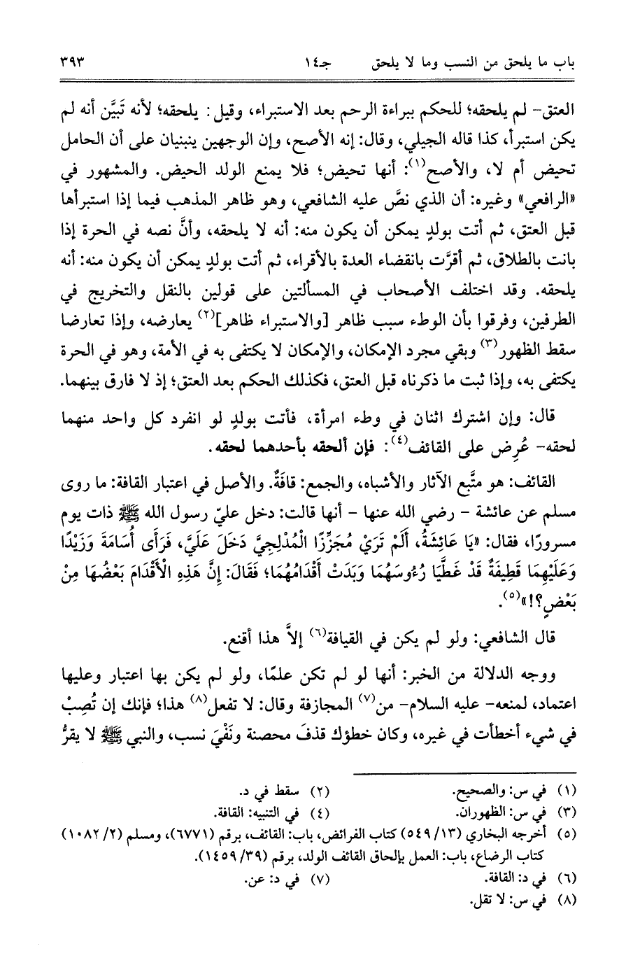 ووجه الدلالة من الخبر: أنها لو لم تكن علماً، ولو لم يكن بها اعتبار وعليها اعتماد، لمنعه- عليه السلام- من المجازفة وقال: لا تفعل هذا؛ فإنك إن تُصِبْ في شيء أخطأت في غيره، وكان خطؤك قذفَ محصنة ونَفْيَ نسب، والنبي صلى الله عليه وسلم لا يقرُّ