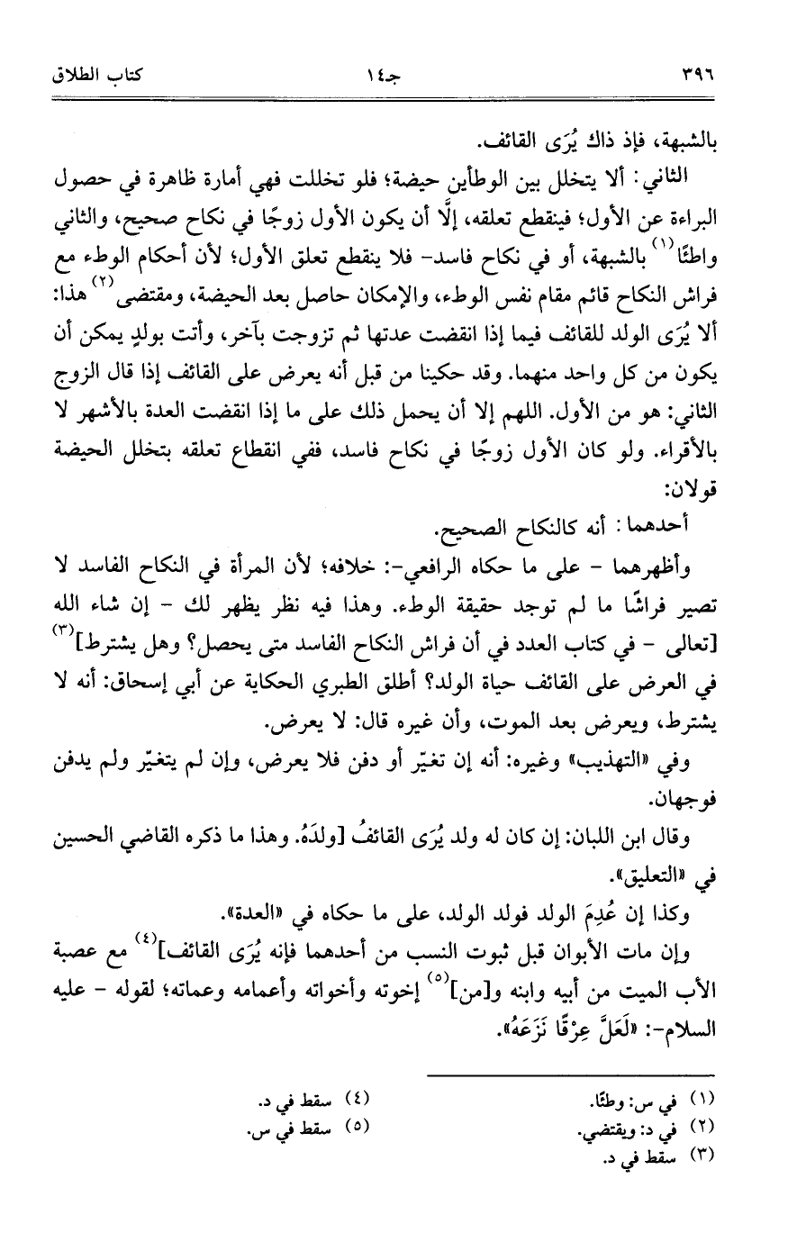 الثاني: ألا يتخلل بين الوطأين حيضة؛ فلو تخللت فهي أمارة ظاهرة في حصول البراءة عن الأول؛ فينقطع تعلقه، إلَّا أن يكون الأول زوجاً في نكاح صحيح، والثاني واطئاً بالشبهة، أو في نكاح فاسد- فلا ينقطع تعلق الأول؛ لأن أحكام الوطء مع فراش النكاح قائم مقام نفس الوطء، والإمكان حاصل بعد الحيضة، ومقتضى هذا: ألا يُرَى الولد للقائف فيما إذا انقضت عدتها ثم تزوجت بآخر، وأتت بولدٍ يمكن أن يكون من كل واحد منهما. وقد حكينا من قبل أنه يعرض على القائف إذا قال الزوج الثاني: هو من الأول. اللهم إلا أن يحمل ذلك على ما إذا انقضت العدة بالأشهر لا بالأقراء. ولو كان الأول زوجاً في نكاح فاسد، ففي انقطاع تعلقه بتخلل الحيضة قولان: