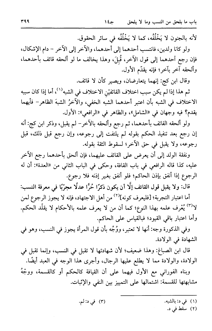 ثم هذا إذا لم يكن سبب اختلاف القائفيْنِ الاختلاف في الشبه، أما إذا كان سببه الاختلاف في الشبه بأن اعتبر أحدهما الشبه الخفي، والآخرُ الشبهَ الظاهر- فأيهما يقدم؟ فيه وجهان في "الشامل"، والظاهر في "الرافعي": الأول.