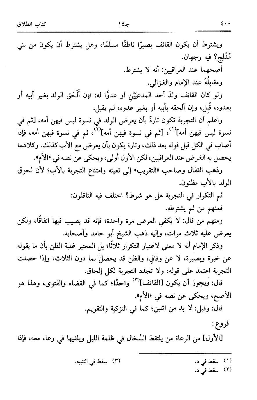 ويشترط أن يكون القائف بصيراً ناطقاً مسلماً، وهل يشترط أن يكون من بني مُدْلِج؟ فيه وجهان.