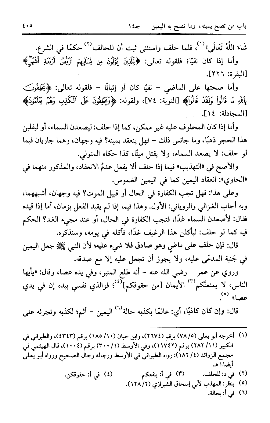 وعلى هذا: فهل تجب الكفارة في الحال أو قبيل الموت؟ فيه وجهان، أشبههما، وبه أجاب الغزالي والروياني: الأول. وهذا فيما إذا لم يقيد الفعل بزمان، أما إذا قيده فقال: لأصعدن السماء غداً، فتجب الكفارة في الحال، أو عند مجيء الغد؟ الحكم فيه كما لو حلف: ليأكلن هذا الرغيف غداً، فأكله في يومه، وسنذكره.