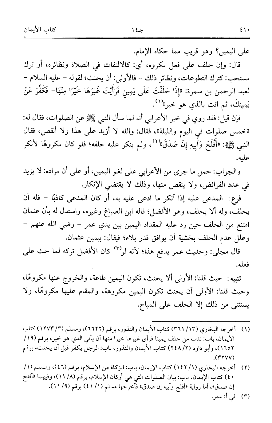 قال: وإن حلف على فعل مكروه، أي: كالالتفات في الصلاة ونظائره، أو ترك مستحب: كترك التطوعات، ونظائر ذلك- فالأولى: أن يحنث؛ لقوله- عليه السلام- لعبد الرحمن بن سمرة: "إِذَا حَلَفْتَ عَلَى يَمِينٍ فَرَأَيْتَ غَيْرَهَا خَيْراً مِنْهَا- فَكَفِّرْ عَنْ يَمِينِكَ، ثم ائت بالذي هو خير".