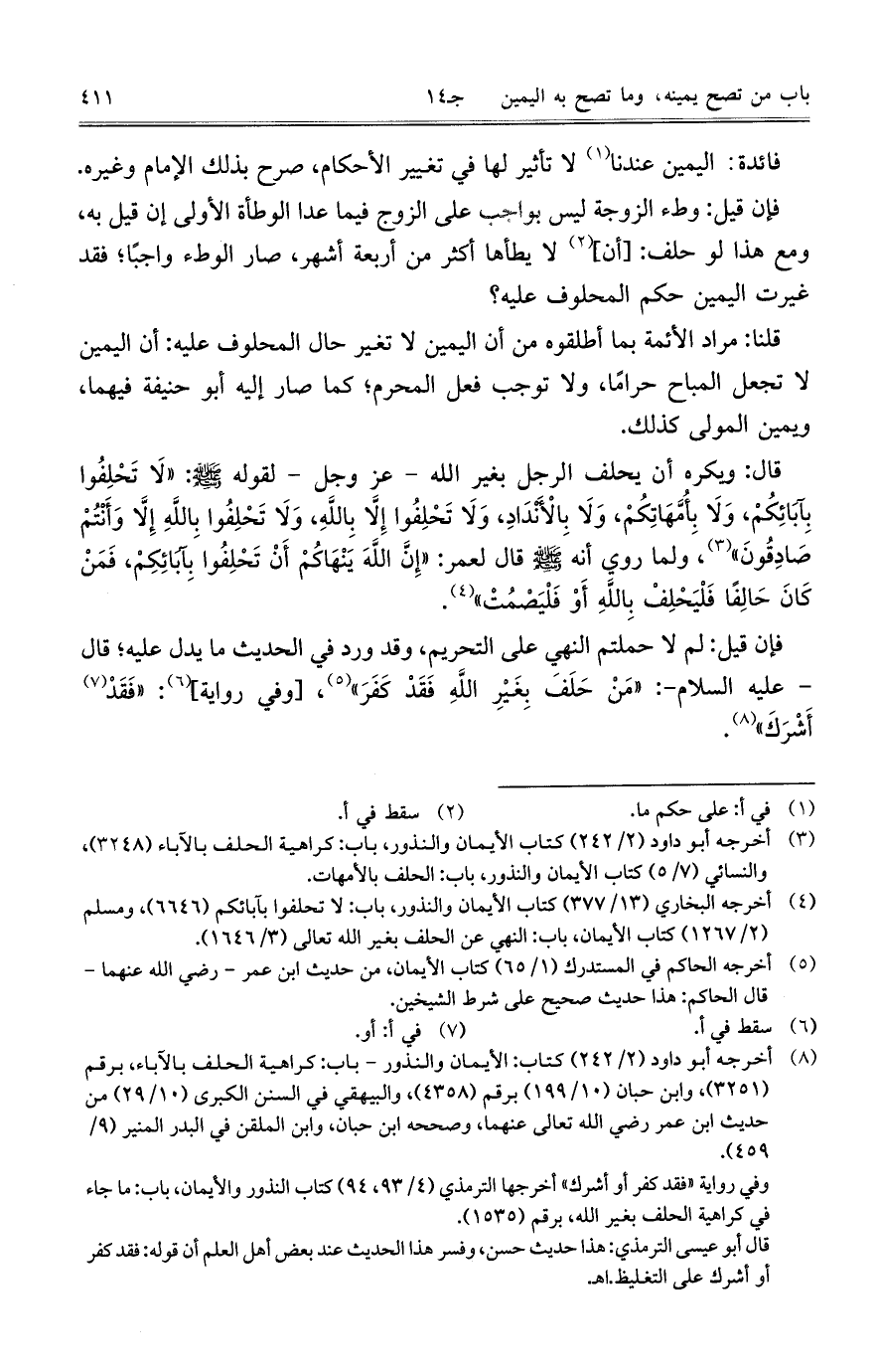 قال: ويكره أن يحلف الرجل بغير الله- عز وجل- لقوله صلى الله عليه وسلم: "لَا تَحْلِفُوا بِآبَائِكُمْ، وَلَا بِأُمَّهَاتِكُمْ، وَلَا بِالْأَنْدَادِ، وَلَا تَحْلِفُوا إِلَّا بِاللهِ، وَلَا تَحْلِفُوا بِاللهِ إِلَّا وَأَنْتُمْ صَادِقُونَ"، ولما روي أنه صلى الله عليه وسلم قال لعمر: "إِنَّ اللهَ يَنْهَاكُمْ أَنْ تَحْلِفُوا بِآبَائِكِمْ، فَمَنْ كَانَ حَالِفَاً فَلْيَحْلِفْ بِاللهِ أَوْ فَلْيَصْمُتْ".