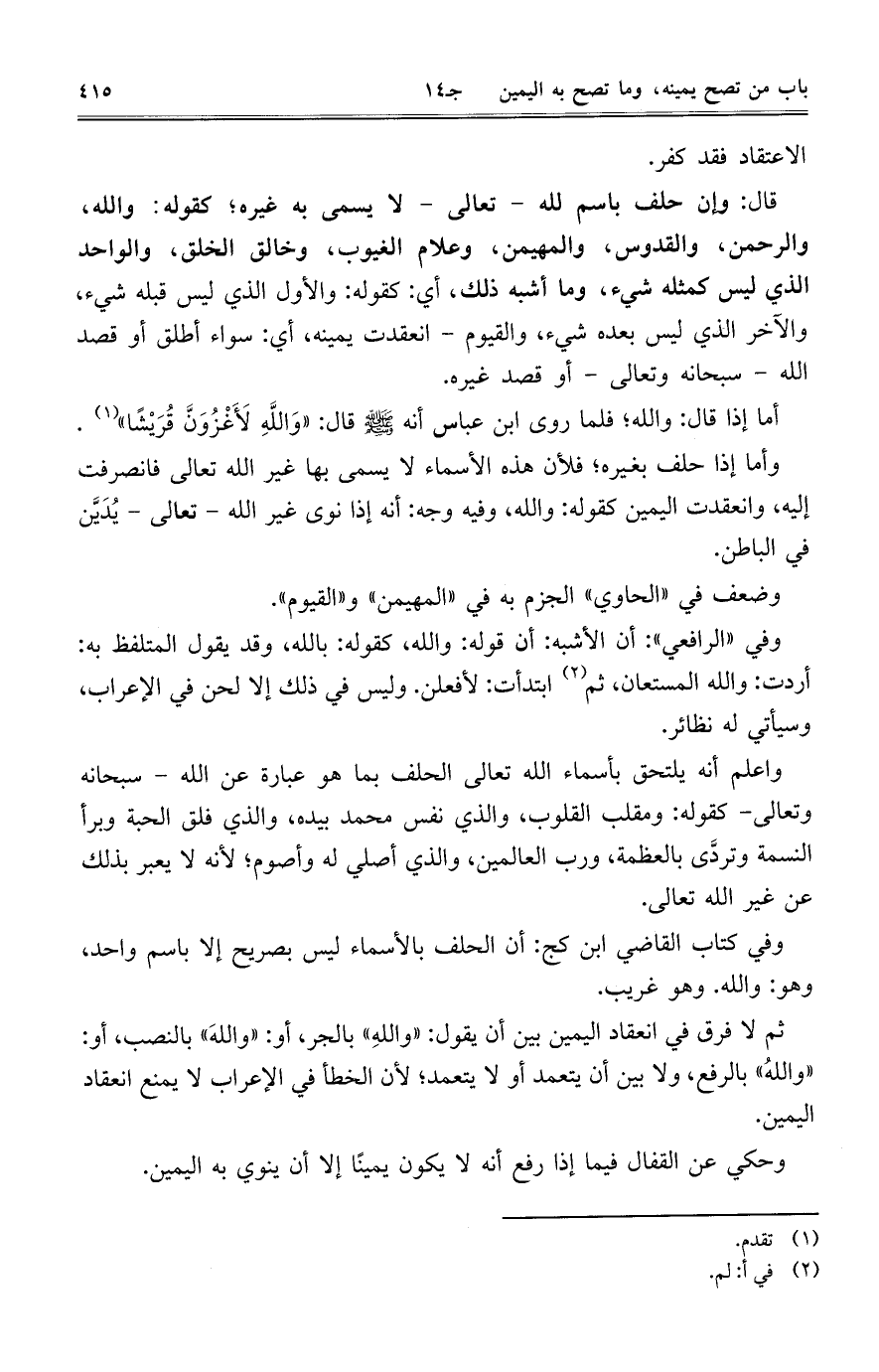 ثم لا فرق في انعقاد اليمين بين أن يقول: "واللهِ" بالجر، أو: "واللهَ" بالنصب، أو: "واللهُ" بالرفع، ولا بين أن يتعمد أو لا يتعمد؛ لأن الخطأ في الإعراب لا يمنع انعقاد اليمين.