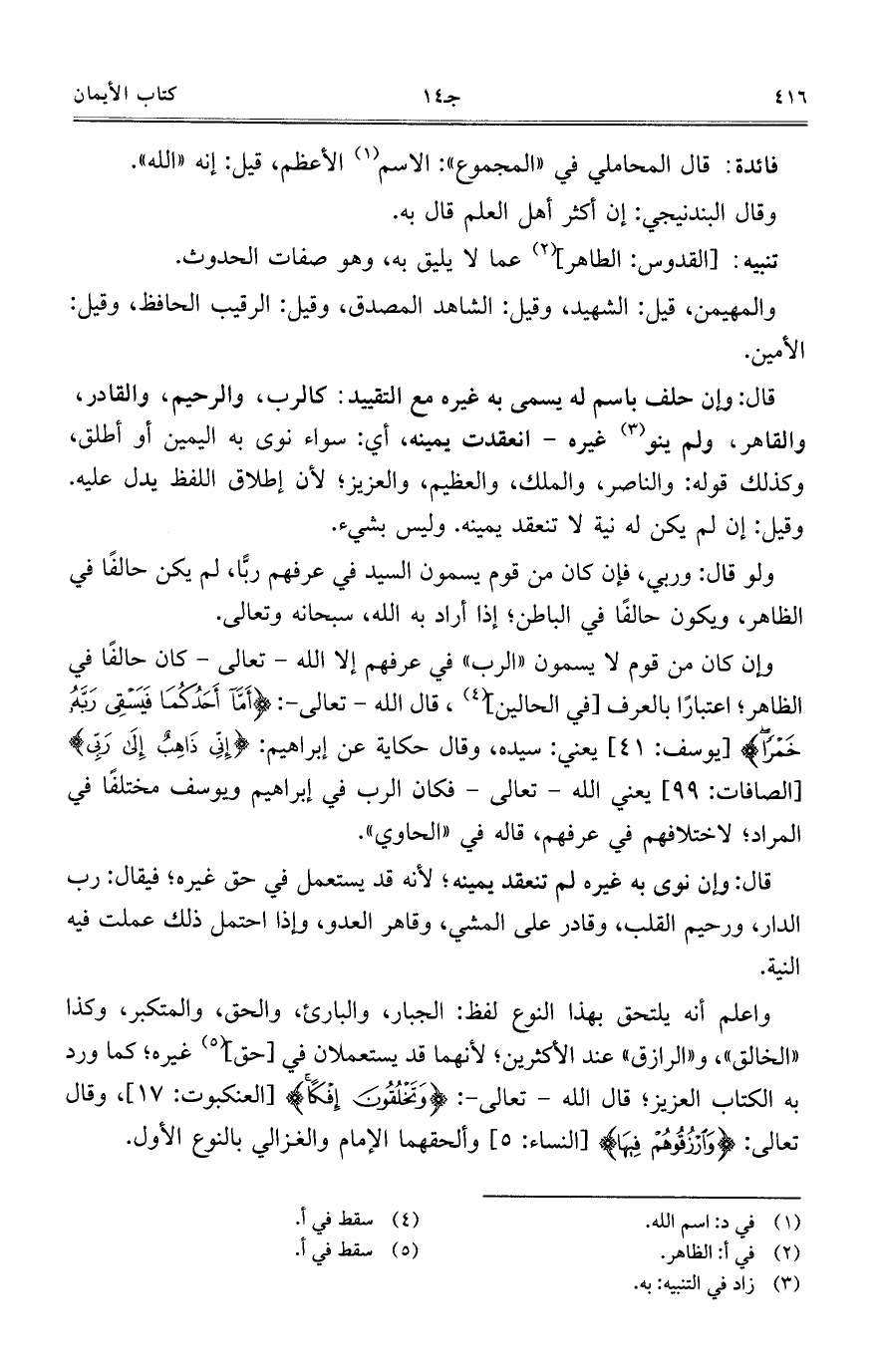 قال: وإن حلف باسم له يسمى به غيره مع التقييد: كالرب، والرحيم، والقادر، والقاهر، ولم ينو غيره- انعقدت يمينه، أي: سواء نوى به اليمين أو أطلق، وكذلك قوله: والناصر، والملك، والعظيم، والعزيز؛ لأن إطلاق اللفظ يدل عليه. وقيل: إن لم يكن له نية لا تنعقد يمينه. وليس بشيء.