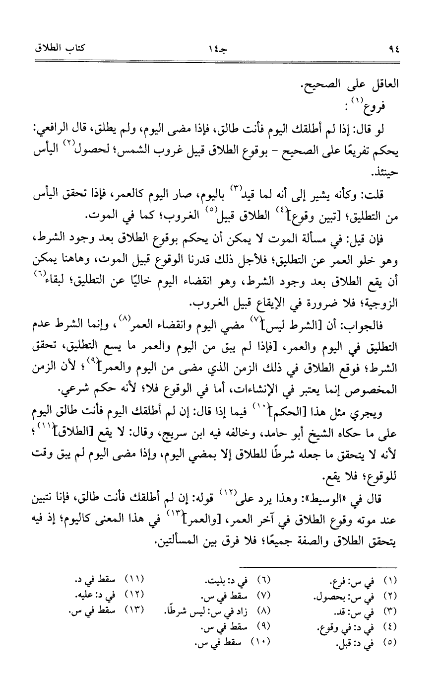 فالجواب: أن [الشرط ليس] مضي اليوم وانقضاء العمر، وإنما الشرط عدم التطليق في اليوم والعمر، [فإذا لم يبق في اليوم والعمر ما يسع التطليق، تحقق الشرط؛ فوقع الطلاق في ذلك الزمن الذي مضى من اليوم والعمر]؛ لأن الزمن المخصوص إنما يعتبر في الإنشاءات، أما في الوقوع فلا؛ لأنه حكم شرعي.