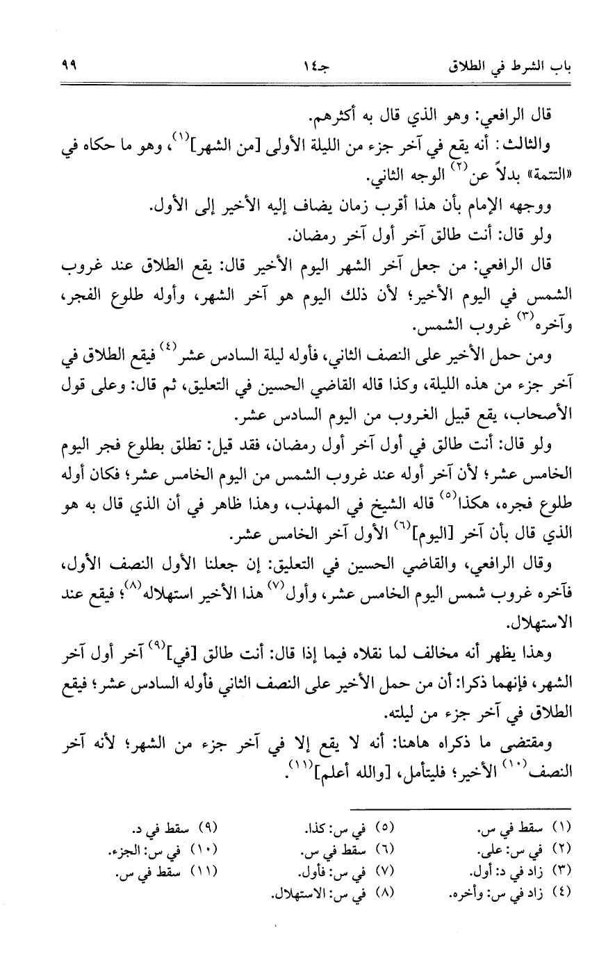 ومن حمل الأخير على النصف الثاني، فأوله ليلة السادس عشر فيقع الطلاق في آخر جزء من هذه الليلة، وكذا قاله القاضي الحسين في التعليق، ثم قال: وعلى قول الأصحاب، يقع قبيلا لغروب من اليوم السادس عشر.