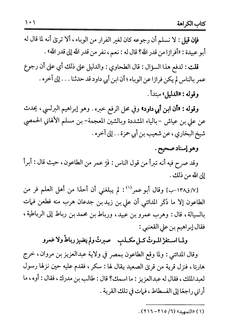 قلت: لدفع هذا السؤال: قال الطحاوي: والدليل علي ذلك أي علي أن رجوع عمر بالناس لم يكن فرارًا عن الوباء؛ أن ابن أبي داود قد حدثنا. . . . إلي آخره.