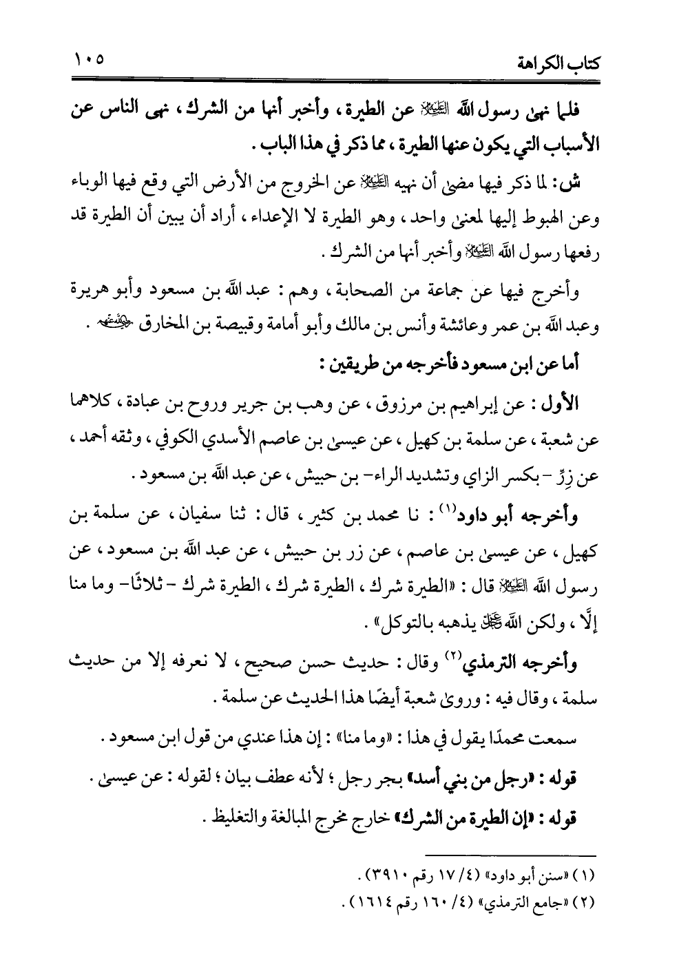 وأخرجه أبو داود (¬1): نا محمَّد بن كثير، قال: ثنا سفيان، عن سلمة بن كهيل، عن عيسى بن عاصم، عن زر بن حبيش، عن عبد الله بن مسعود، عن رسول الله -عليه السلام- قال: "الطيرة شرك، الطيرة شرك، الطيرة شرك -ثلاثًا- وما منا إلَّا, ولكن الله -عز وجل- يذهبه بالتوكل".