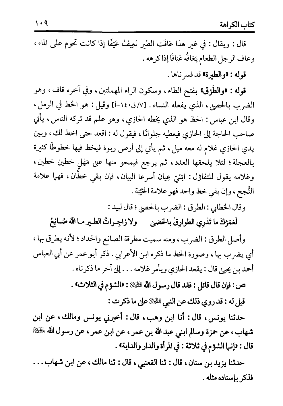 وأصل الطرق: الضرب، ومنه سميت مطرقة الصانع والحداد؛ لأنه يطرق بها، أي يضرب بها، وصورة الخط ما ذكره ابن الأعرابي. ذكر أبو عمر عن أبي العباس أحمد بن يحيى قال: يقعد الحازي ويأمر غلامه. . . . إلي آخر ما ذكرناه.