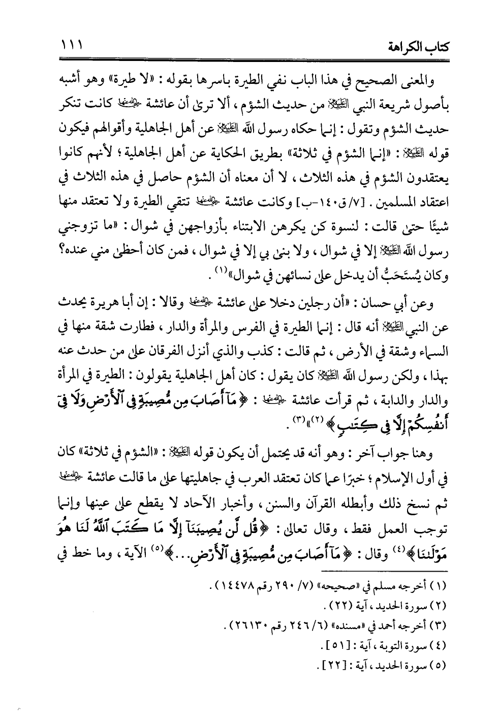 وعن أبي حسان: "أن رجلين دخلا علي عائشة - رضي الله عنها - وقالا: إن أبا هريرة يحدث عن النبي -عليه السلام- أنه قال: إنما الطيرة في الفرس والمرأة والدار، فطارت شقة منها في السماء وشقة في الأرض، ثم قالت: كذب والذي أنزل الفرقان علي من حدث عنه بهذا, ولكن رسول الله -عليه السلام- كان يقول: كان أهل الجاهلية يقولون: الطيرة في المرأة والدار والدابة، ثم قرأت عائشة - رضي الله عنها -: {مَا أَصَابَ مِنْ مُصِيبَةٍ فِي الْأَرْضِ وَلَا فِي أَنْفُسِكُمْ إِلَّا فِي كِتَابٍ} (¬2) " (¬3).