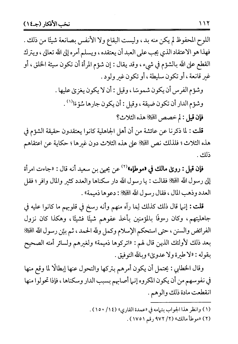 اللوح المحفوظ لم يكن منه بد، وليست البقاع ولا الأنفس بصانعة شيئًا من ذلك. فهذا هو الاعتقاد الذي يجب على العبد أن يعتقده، ويسلم أمره إلى الله تعالى، ويترك القطع علي الله بالشؤم في شيء، وقد يقال: إن شؤم المرأة أن تكون سيئة الخلق، أو غير قانعة، أو تكون سليطة، أو تكون غير ولود.
