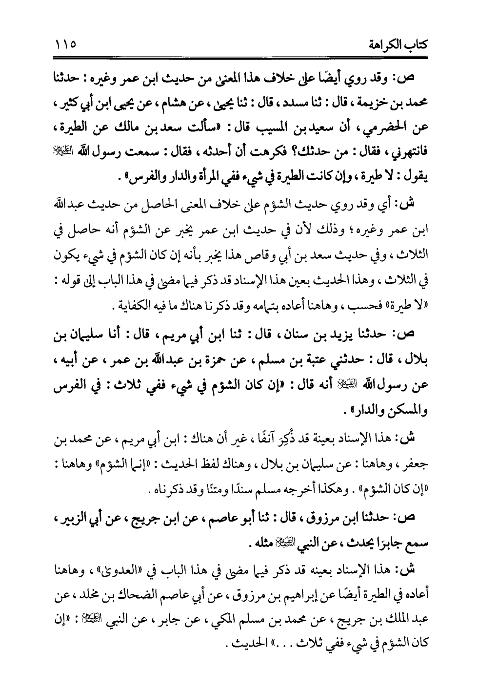 ش: هذا الإسناد بعينه قد ذكر فيما مضى في هذا الباب في "العدوى"، وهاهنا أعاده في الطيرة أيضًا عن إبراهيم بن مرزوق، عن أبي عاصم الضحاك بن مخلد، عن عبد الملك بن جريج، عن محمَّد بن مسلم المكي، عن جابر، عن النبي -عليه السلام-: "إن كان الشؤم في شيء ففي ثلاث. . . ." الحديث.