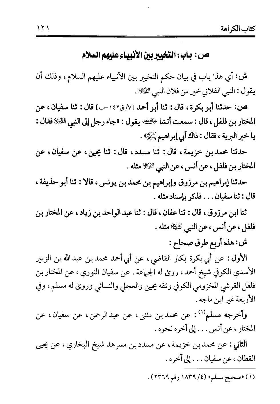 ش: أي هذا باب في بيان حكم التخيير بين الأنبياء -عليهم السلام-، وذلك أن يقول: النبي الفلاني خير من فلان النبي -عليه السلام-.